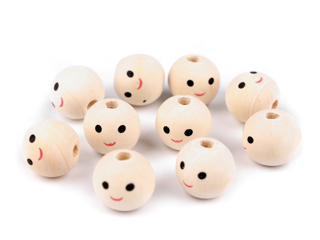 Dřevěné korálky s malovaným obličejem. Můžete je použít např. na háčkované panáčky, vytvořit veselý náhrdelník, vyrobit prstové maňásky, veselé zápichy do květináče apod.