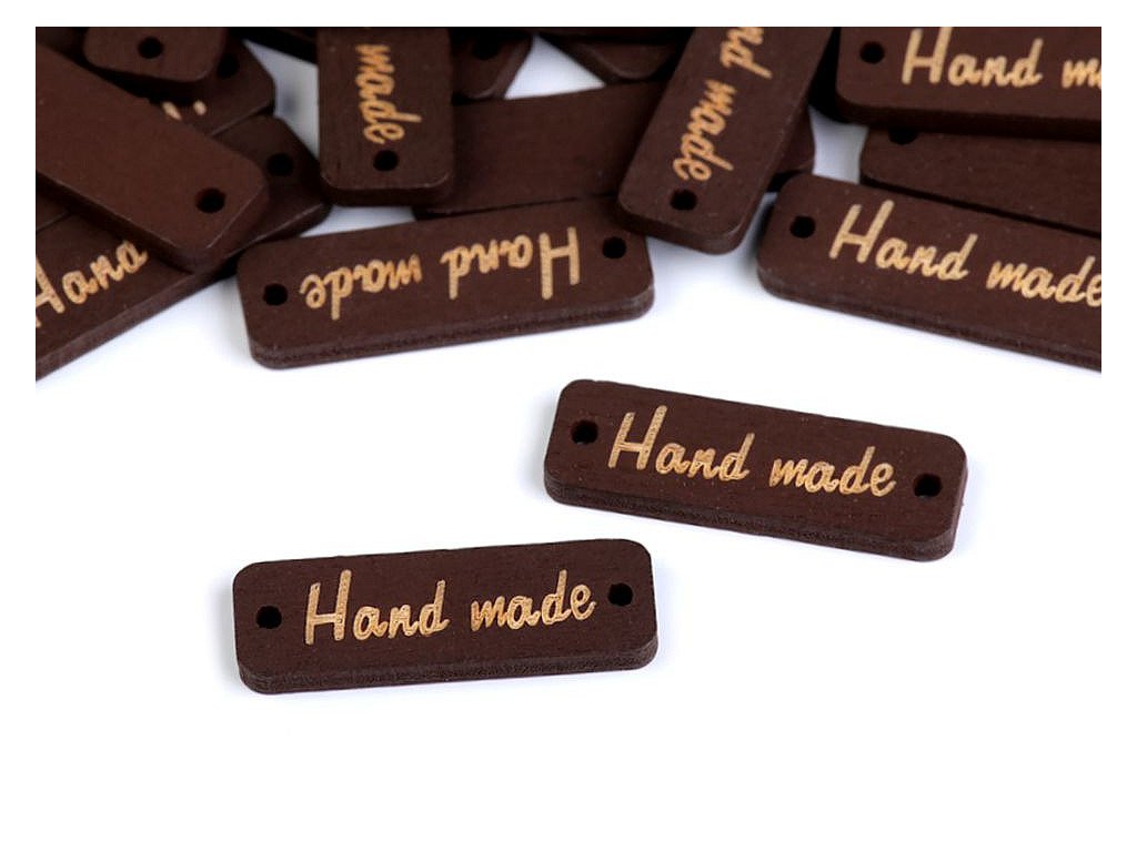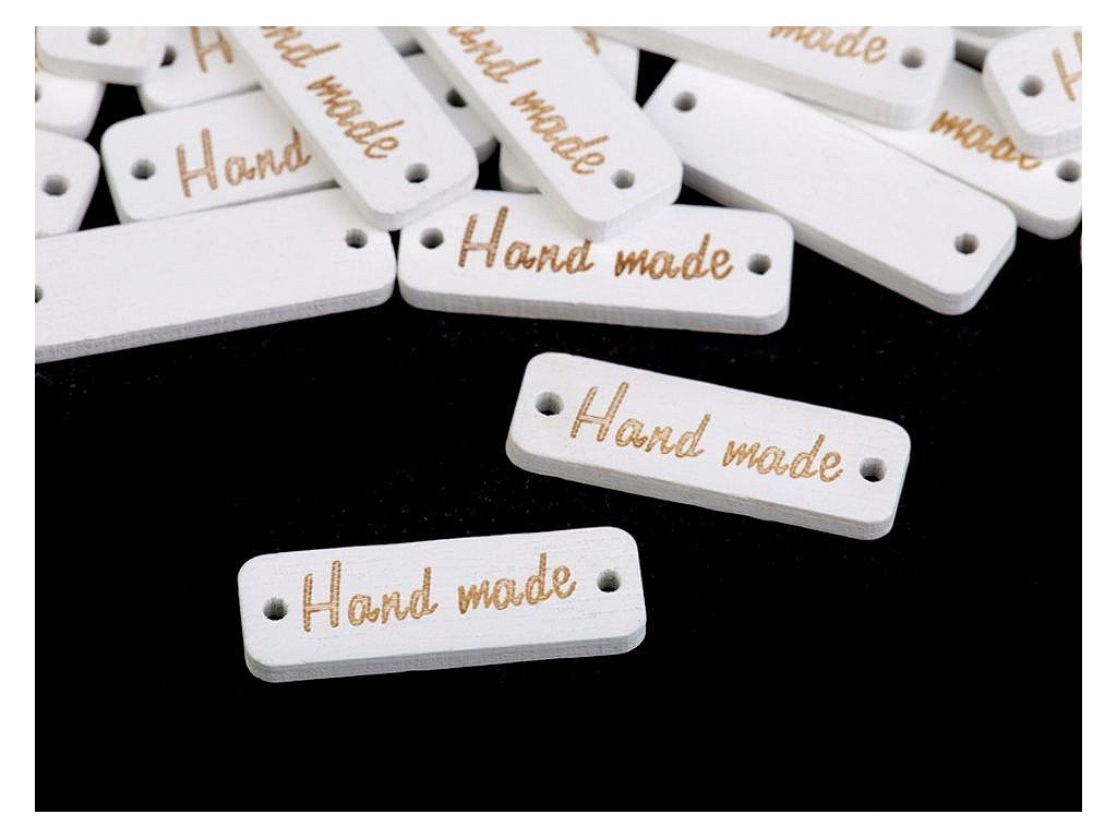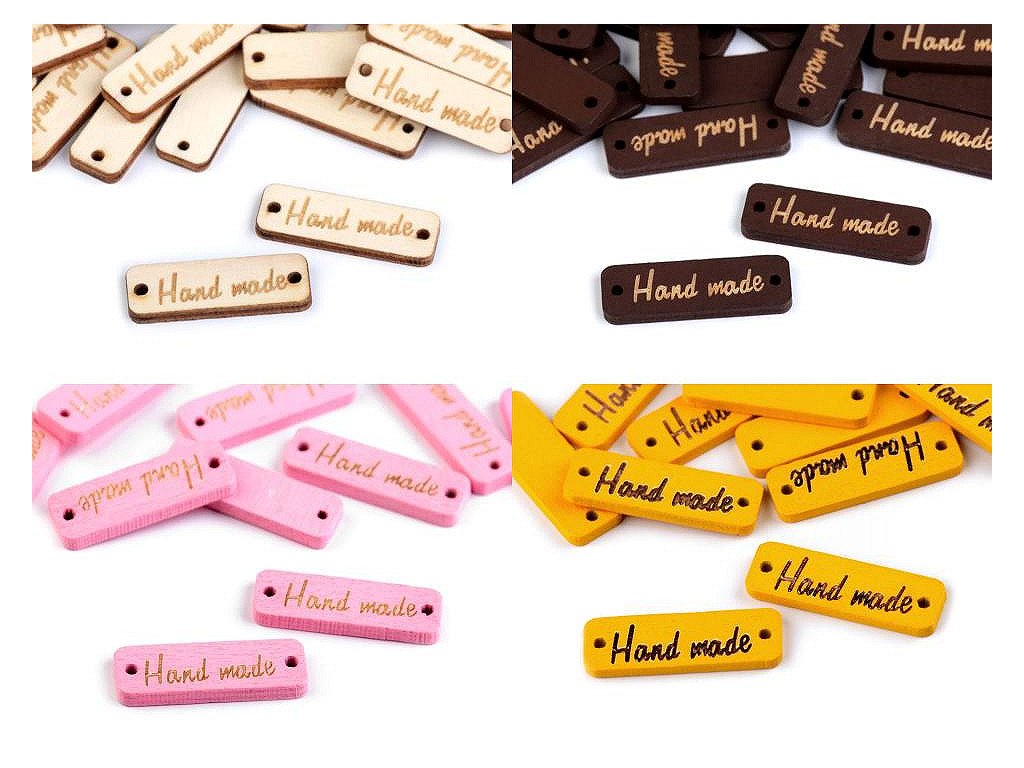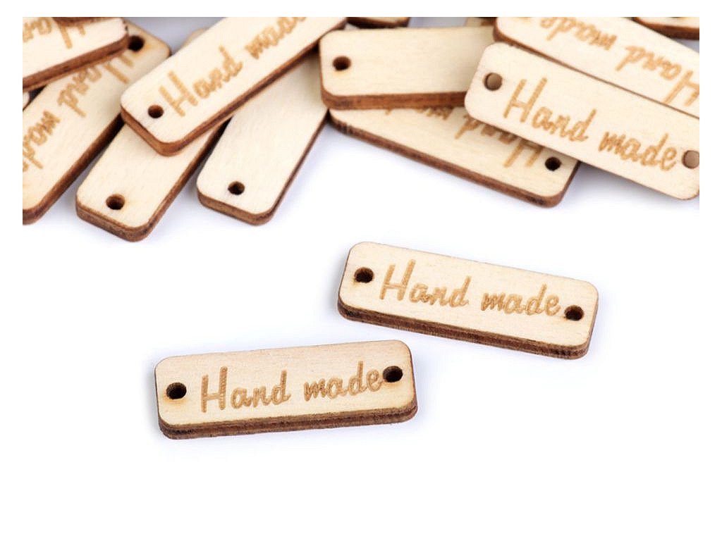 Dřevěnou cedulku obdélníkového tvaru se zaoblenými rohy zdobí jednostranný nápis "hand made". Po stranách jsou dírky, kterými lze provléct šňůrku a cedulku tak pověsit na dekoraci.