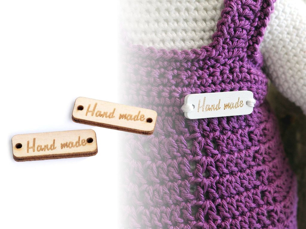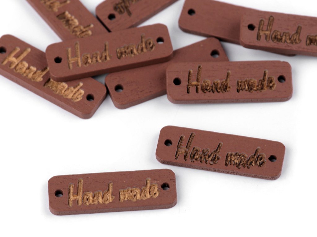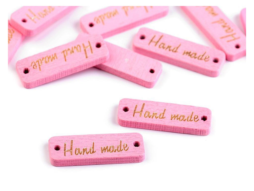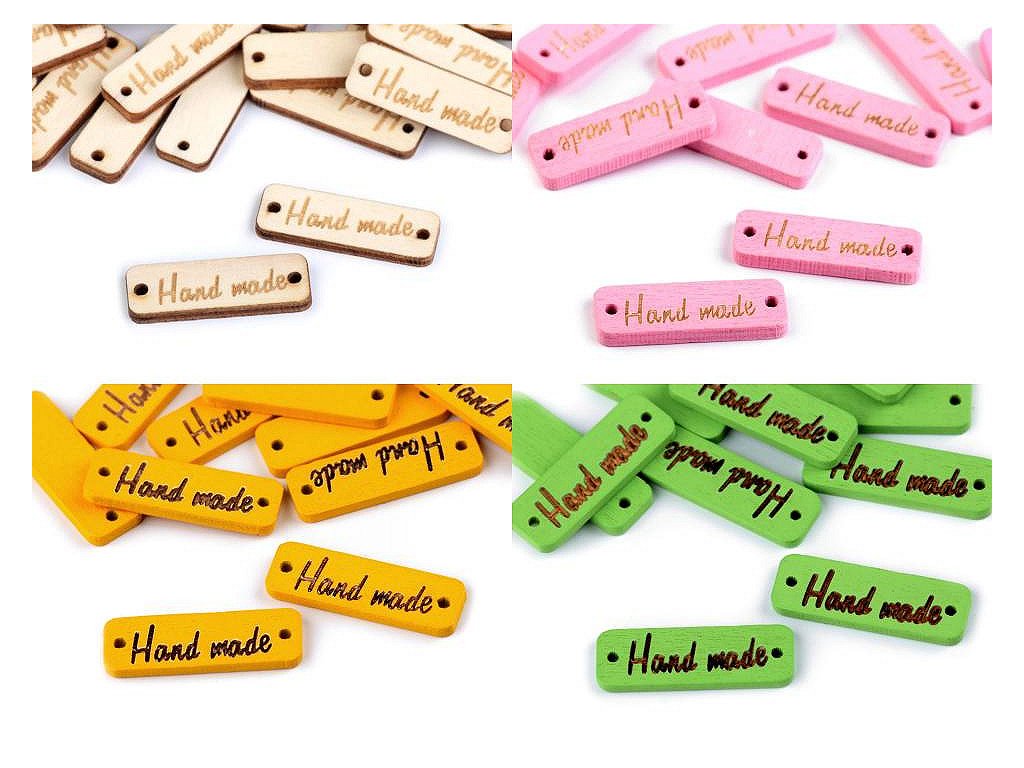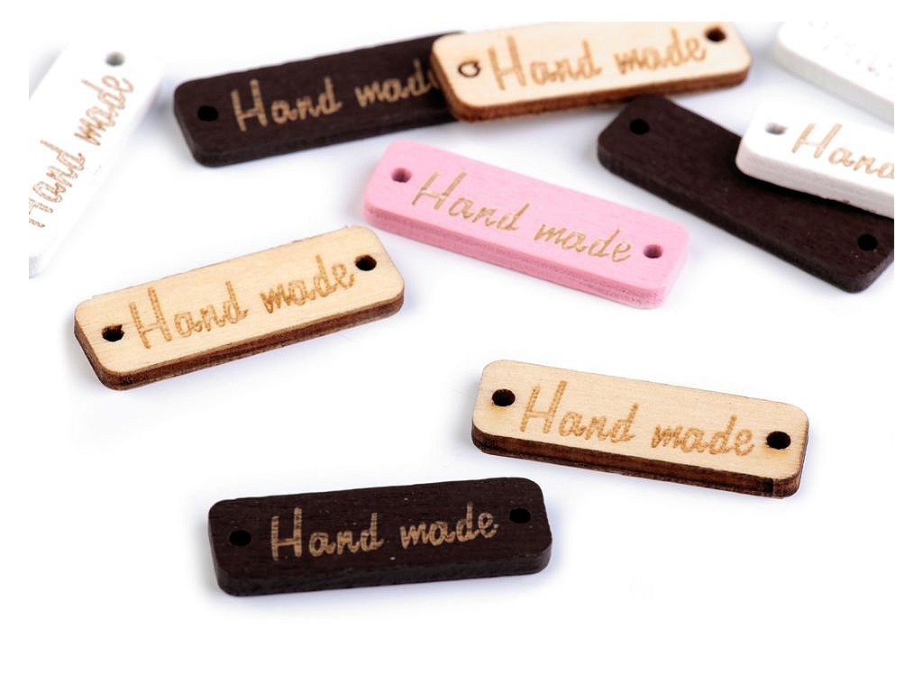 Dřevěnou cedulku obdélníkového tvaru se zaoblenými rohy zdobí jednostranný nápis "hand made". Po stranách jsou dírky, kterými lze provléct šňůrku a cedulku tak pověsit na dekoraci.