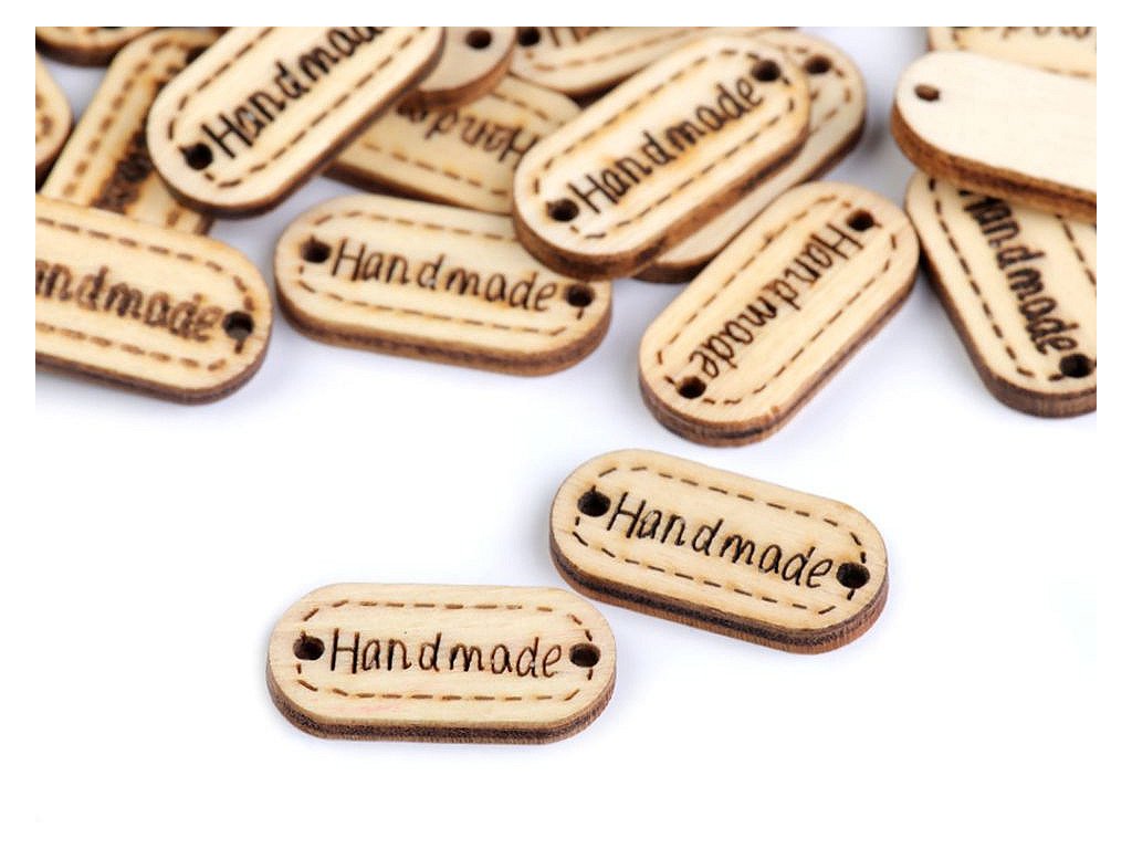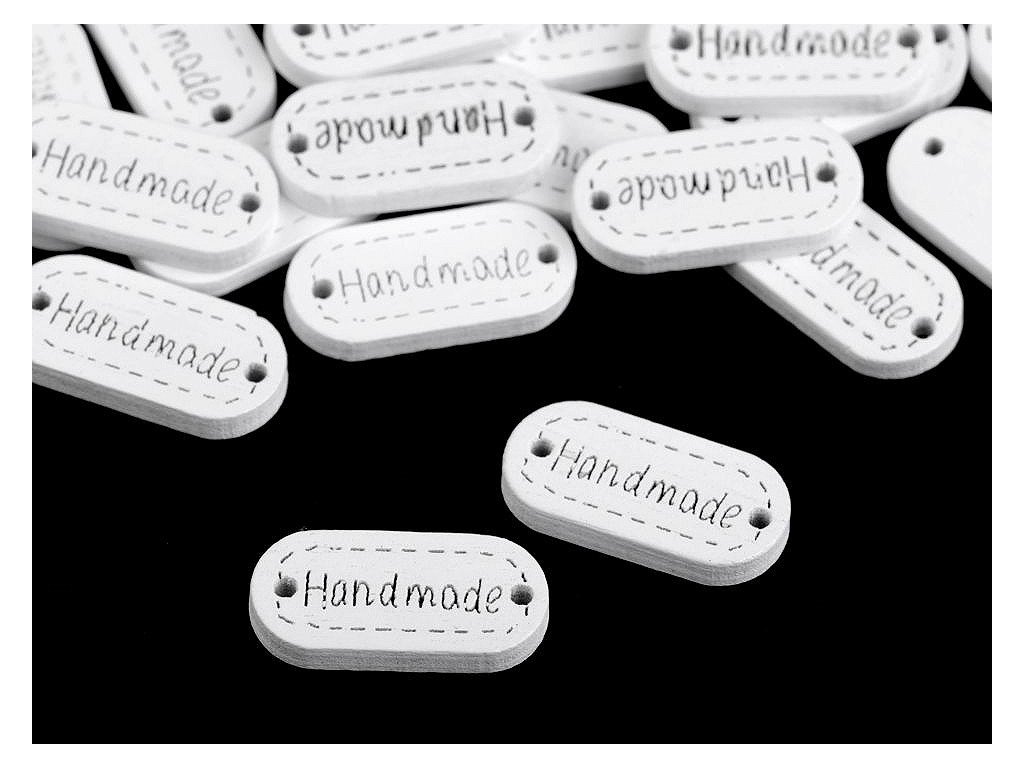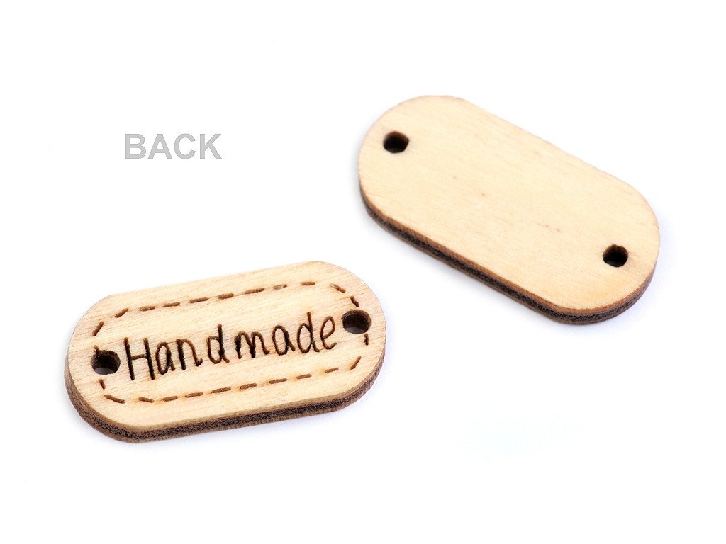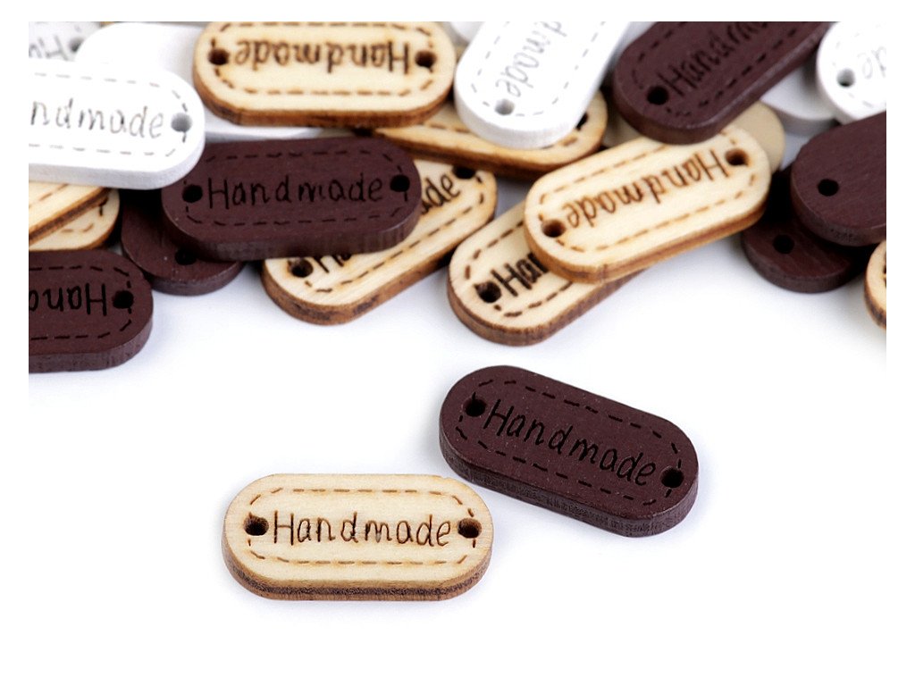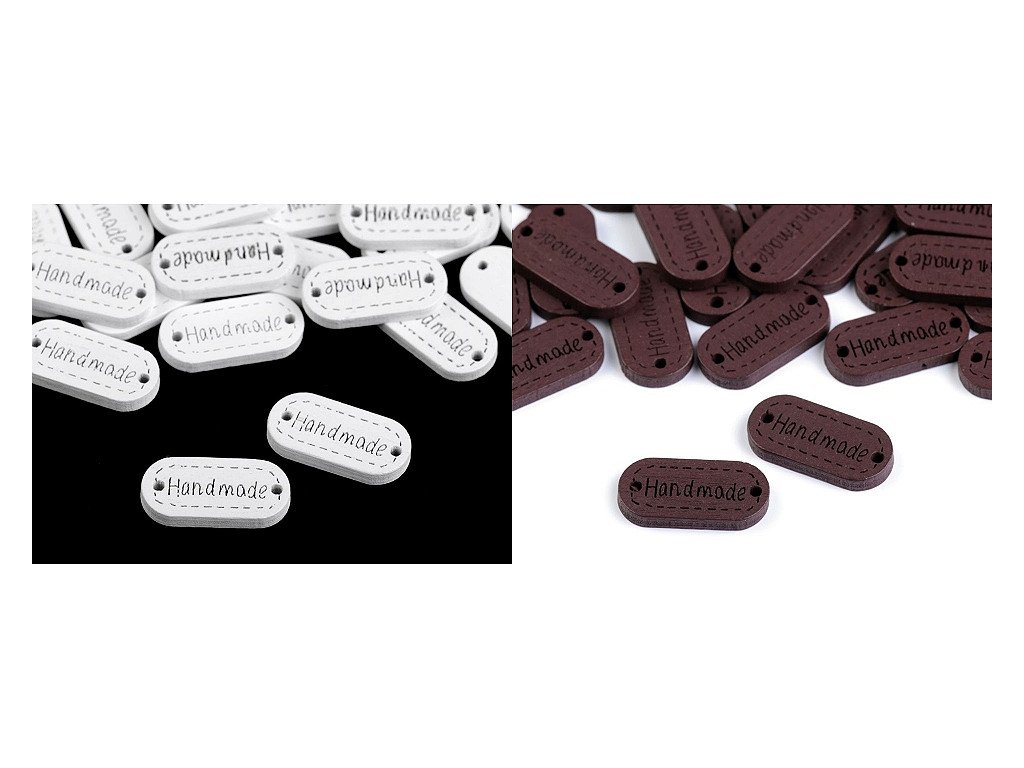 Dřevěnou cedulku oválného tvaru zdobí jednostranný nápis "hand made". Po stranách cedulky jsou dírky, kterými lze provléct šňůrku a cedulku tak pověsit na dekoraci.