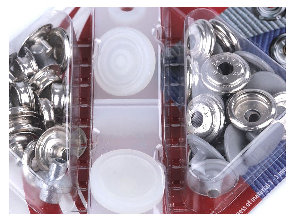 Stiskací knoflíky se používají ke spojování běžných druhů látek. Nýtování se provádí plastovým mini lisem, který je součástí balení. Knoflíky jsou nerezavějící. Návod na nýtování viz obrázek.