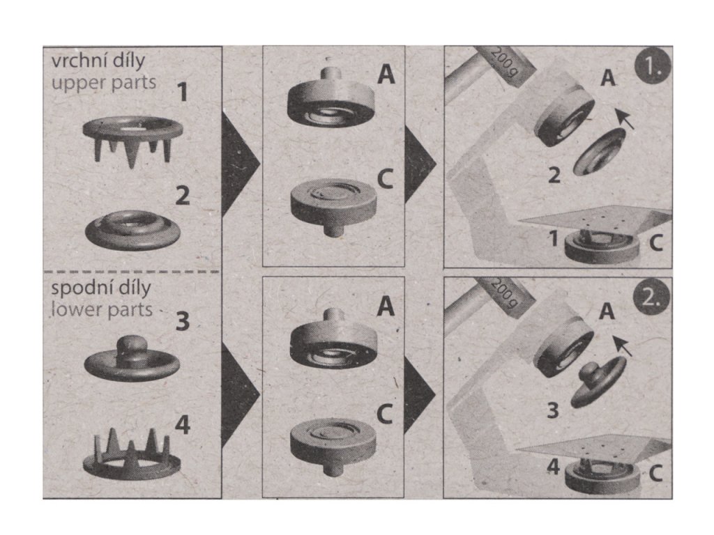Knoflíky se používají ke spojování jemných a poddajných druhů látek - froté, úplet, košilovina aj. Nýtování se provádí mini lisem, který je součást balení.