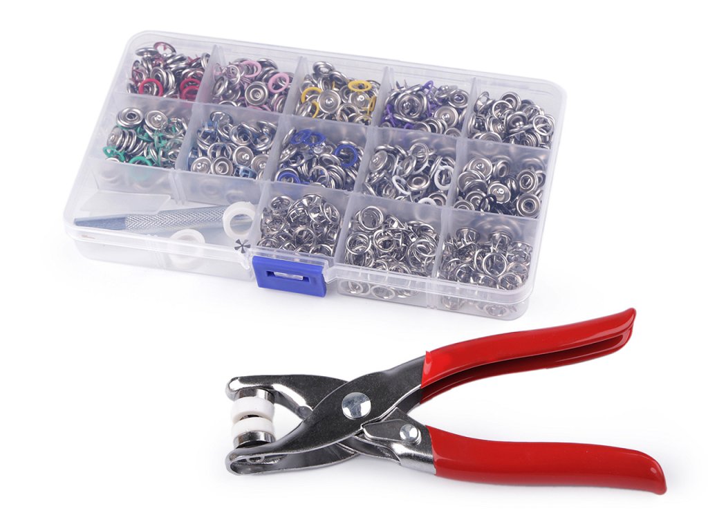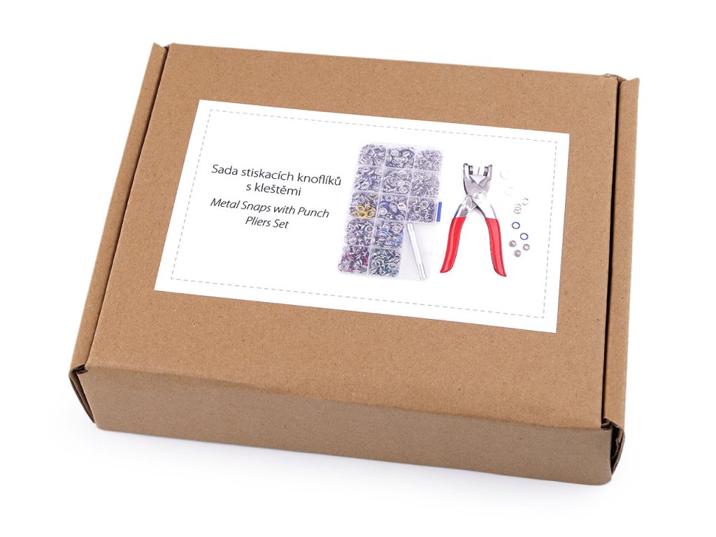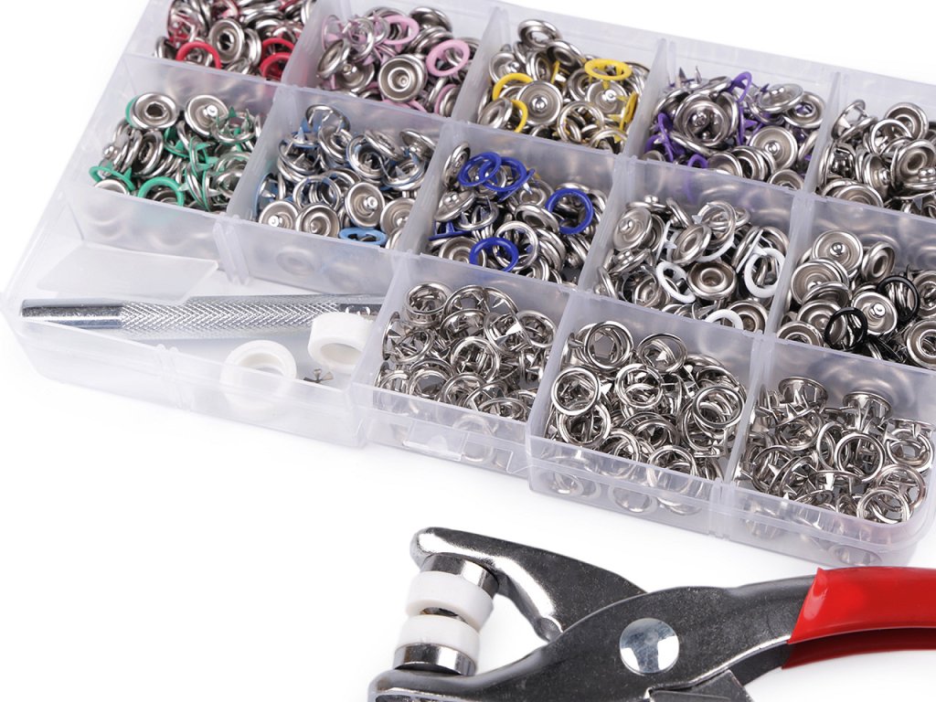 Kovové stiskací knoflíky (patentky) využijete jako zapínání na oblečení a doplňky. K aplikaci vám pomůže kleště, které jsou součástí sady, nebo můžete využít i razič (délka 7 cm).