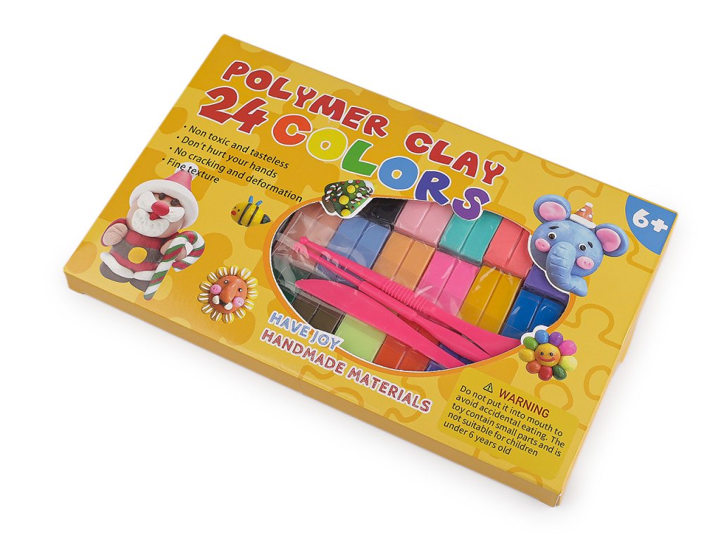 Sada modelovacích polymerových hmot obsahuje 24 ks různých barev. Uvnitř balení najdete i praktické modelovací nářadí a fotonávody.