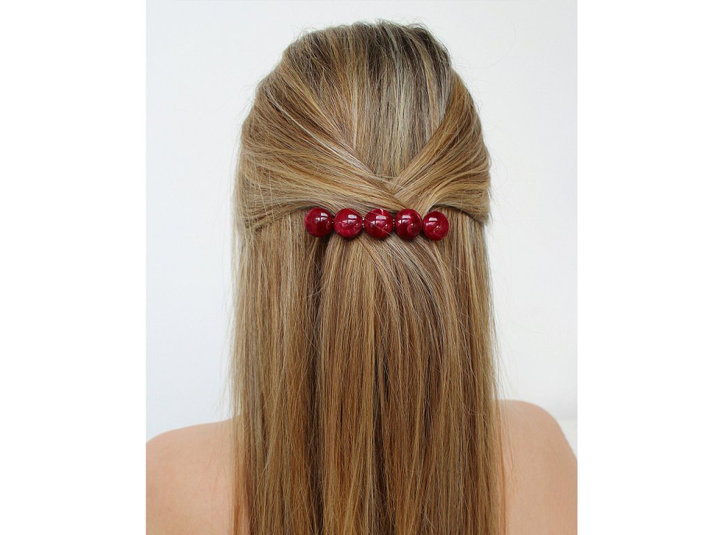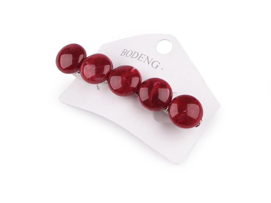 Francouzská spona zdobená kulatými akrylátovými kameny, které jsou inspirovány pravými minerály, poutavě ozdobí váš účes. Ať už máte jemné prameny nebo husté lokny, touto sponou snadno sepnete vlasy do copu nebo vytvoříte elegantní drdol, který bude vypadat, jako kdyby ho vytvořil profesionál. Spona má kvalitní celokovové provedení, zacvakávací mechanismus je pevný. Délka části pro vlasy je 5,5 cm.
