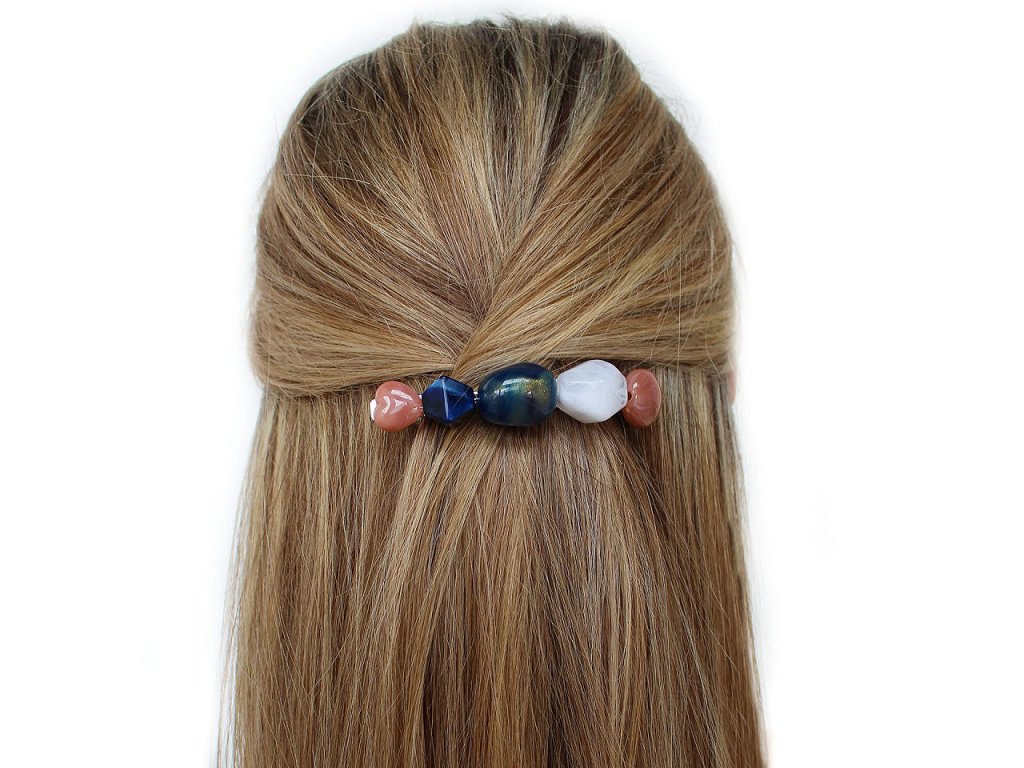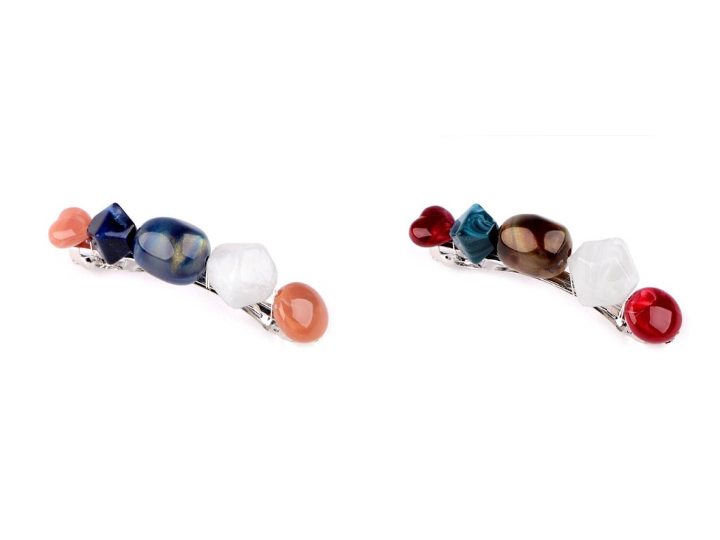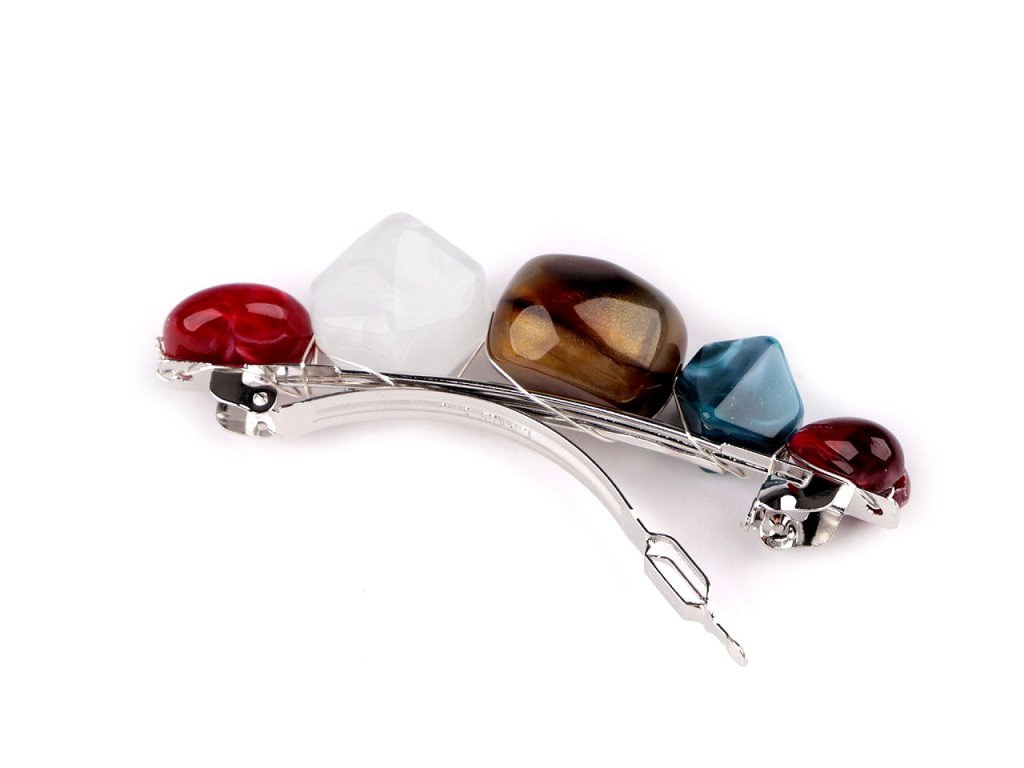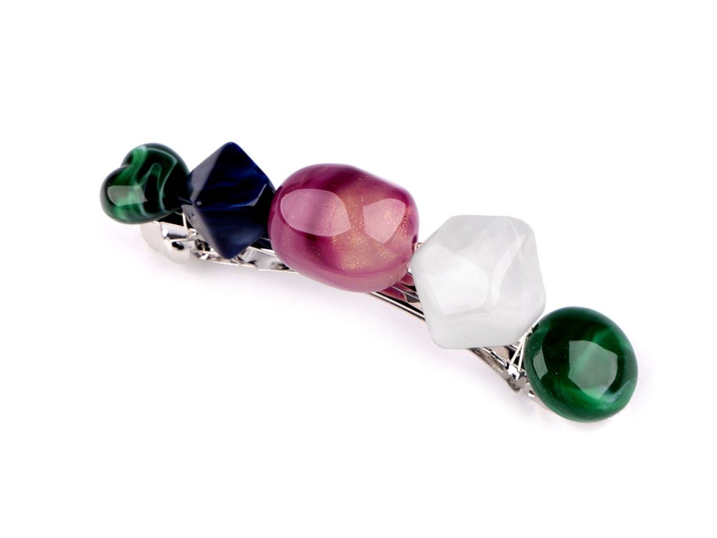 Francouzská spona zdobená akrylátovými kameny, které jsou inspirovány pravými minerály, poutavě ozdobí váš účes. Ať už máte jemné prameny nebo husté lokny, touto sponou snadno sepnete vlasy do copu nebo vytvoříte elegantní drdol, který bude vypadat, jako kdyby ho vytvořil profesionál. Spona má kvalitní celokovové provedení, zacvakávací mechanismus je pevný. Délka části pro vlasy je 5,5 cm.
