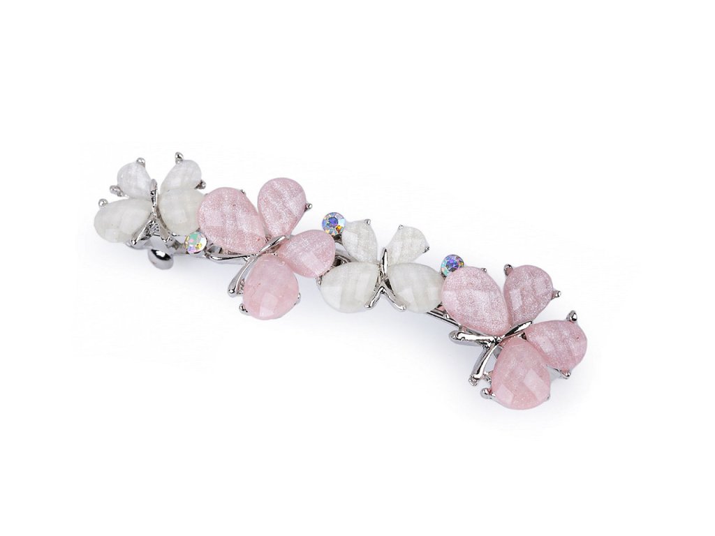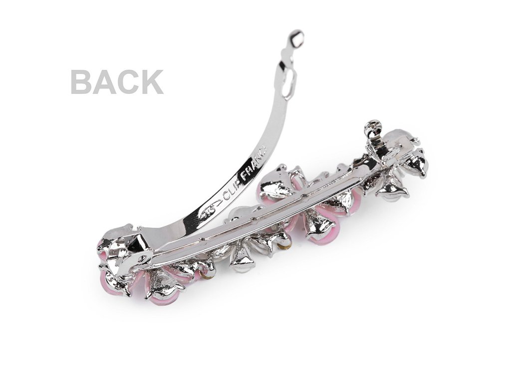 Zdobená francouzská spona luxusně ozdobí slavnostní účes. Díky zakomponovaným broušeným kamínkům se oslnivě třpytí. Má velmi kvalitní celokovové provedení. Zacvakávací mechanismus je pevný.