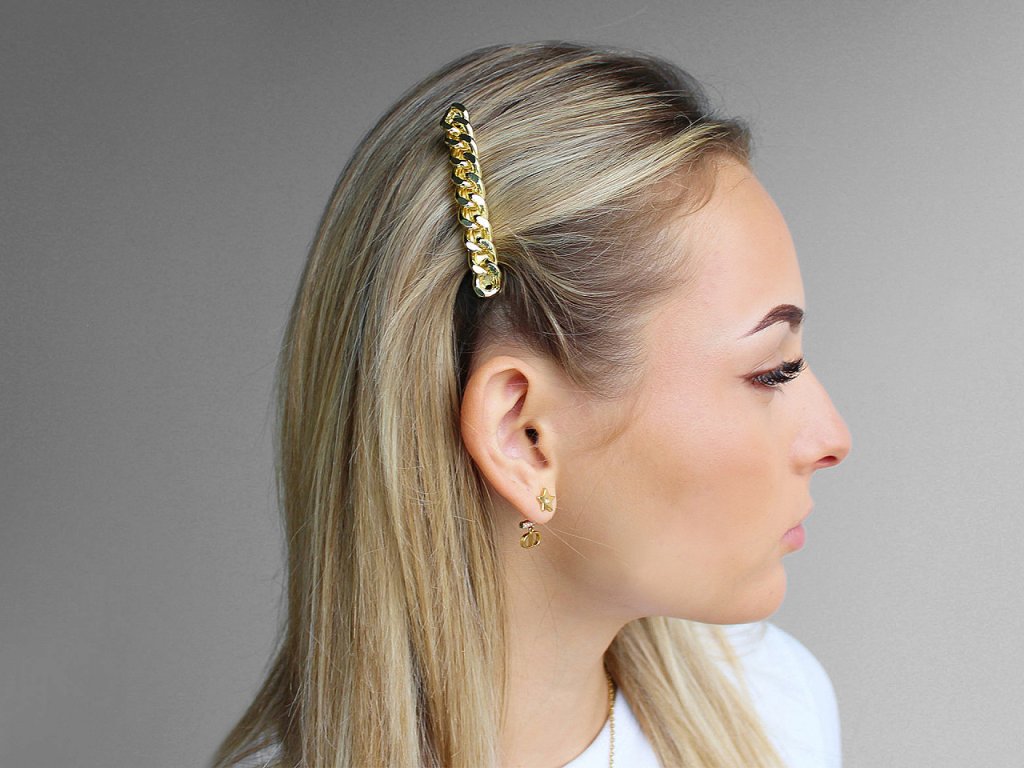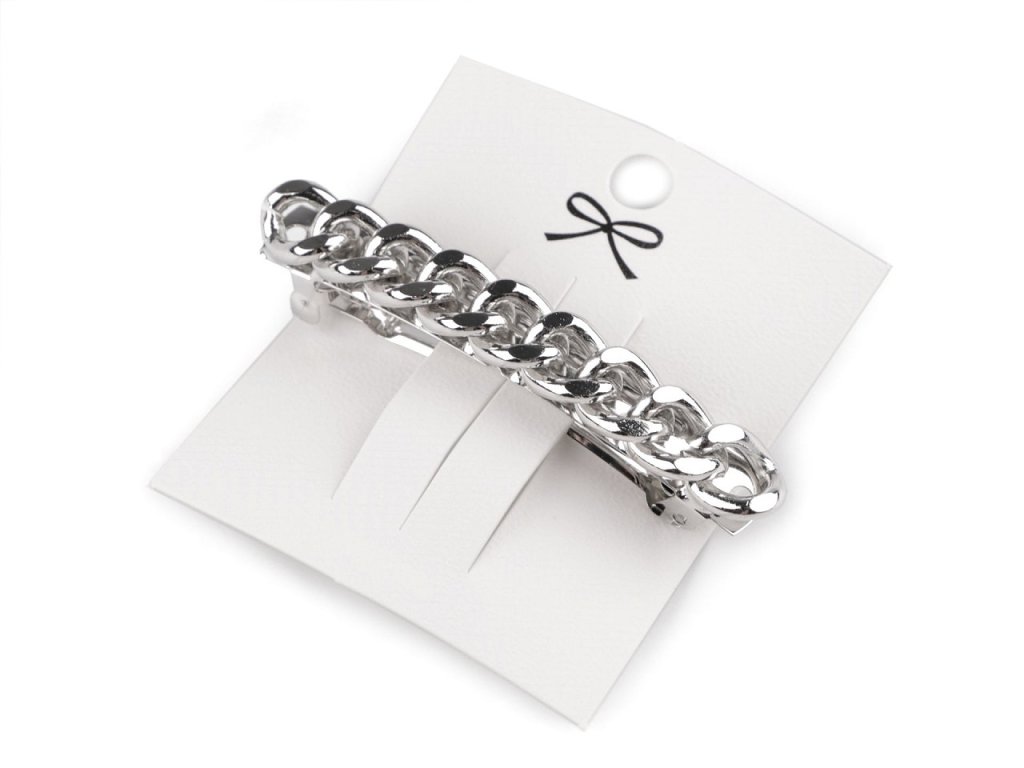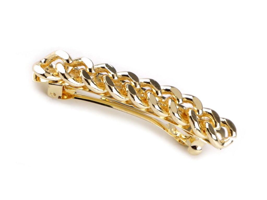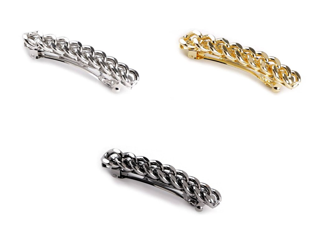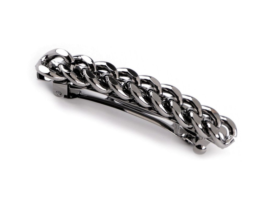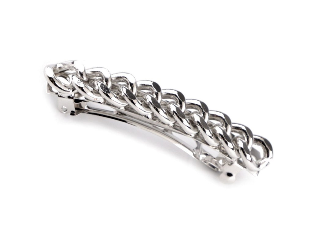 Francouzská spona ozdobená řetězem má velmi kvalitní celokovové provedení. Je lesklá, což z ní činí perfektní volbu pro slavnostní příležitosti i každodenní nošení. Vašemu účesu dodá nevšední nádech a originalitu. Zacvakávací mechanismus zapínání je pevný a spolehlivý, spona udrží vaše vlasy dokonale na svém místě po celý den.