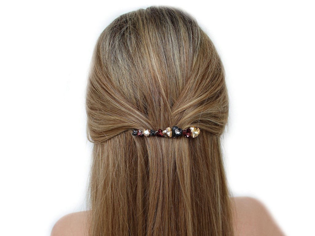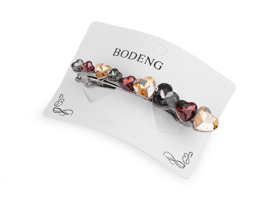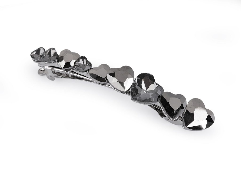 Francouzská spona zdobená akrylátovými broušenými srdci luxusně ozdobí váš účes. Má nádherný lesk, který přitahuje pozornost. Ať už máte jemné prameny nebo husté lokny, touto sponou snadno sepnete vlasy do copu nebo vytvoříte elegantní drdol, který bude vypadat, jako kdyby ho vytvořil profesionál. Spona má kvalitní celokovové provedení, zacvakávací mechanismus je pevný. Délka části pro vlasy je 4,5 cm.