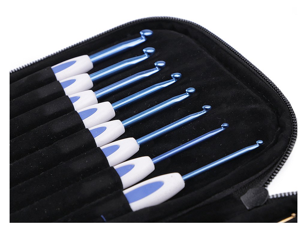 Sada háčků na háčkování je zabalena v pouzdře, které můžete snadno uzavřít pomocí zipu. Vnitřek pouzdra je sametový.