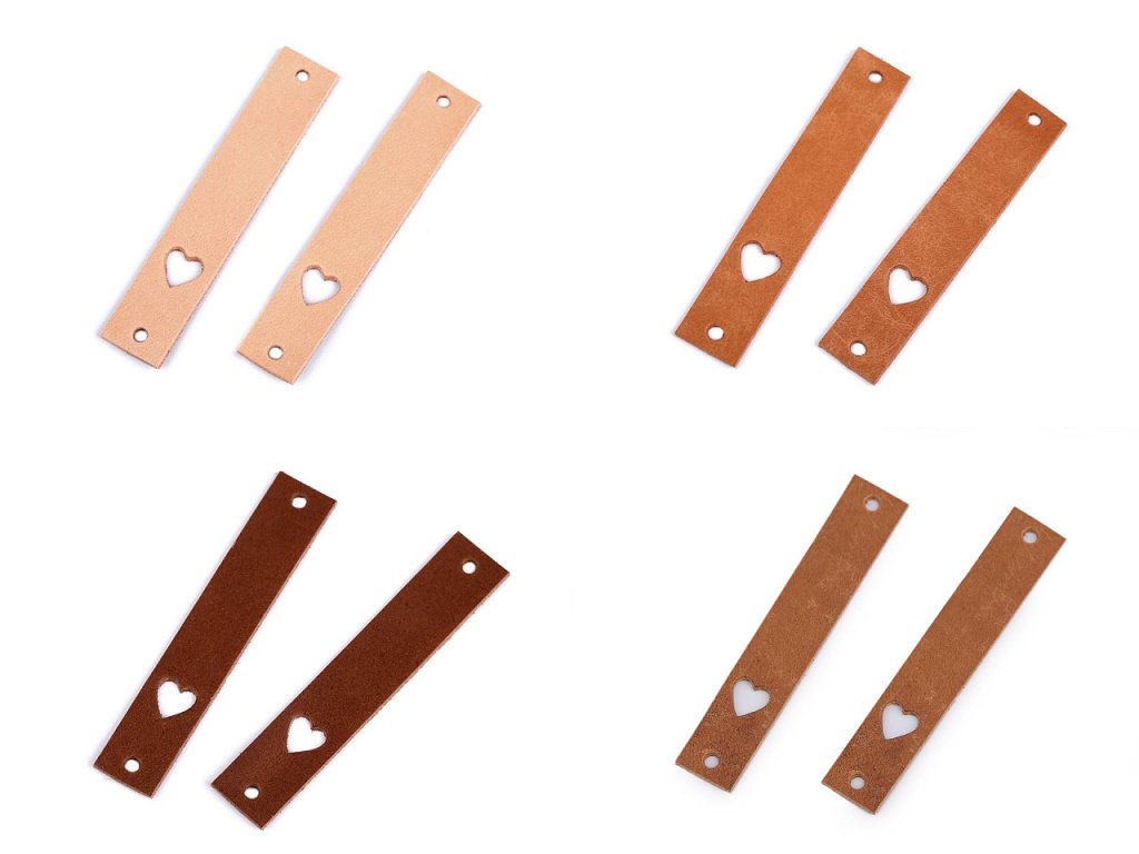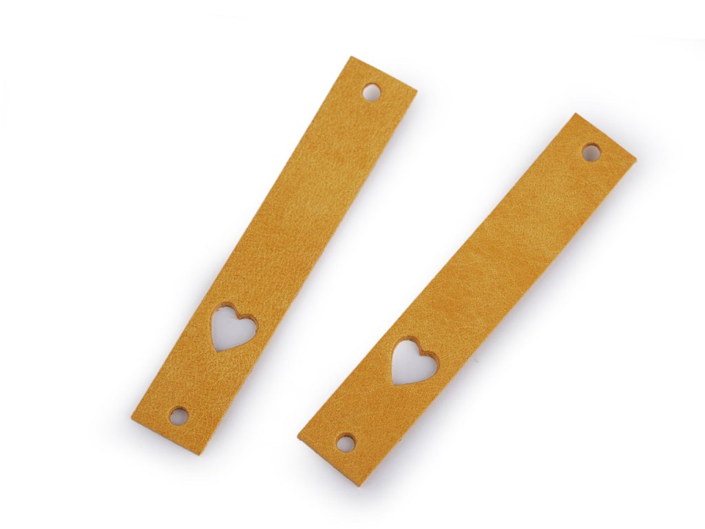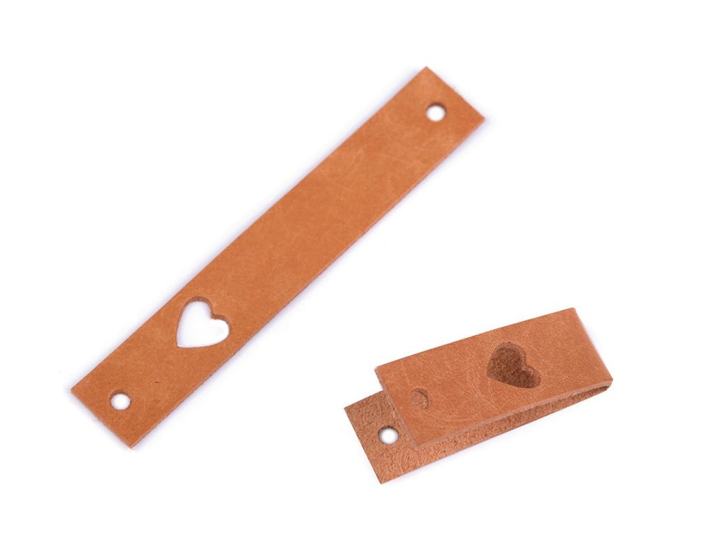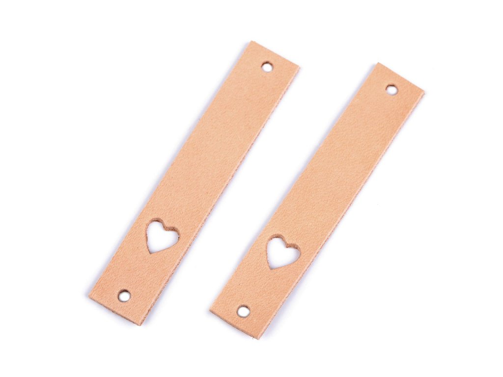 Kožená cedulka je jednostranná, na bocích má otvory k přišití. Zdobí ji vyražený otvor srdíčka.
