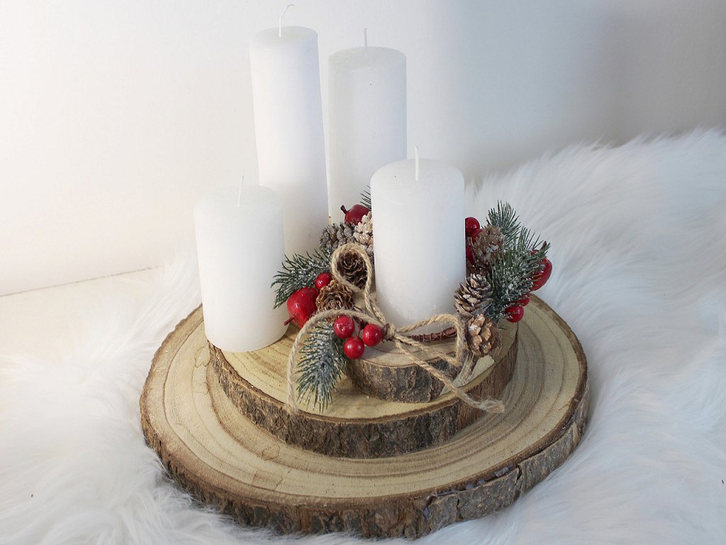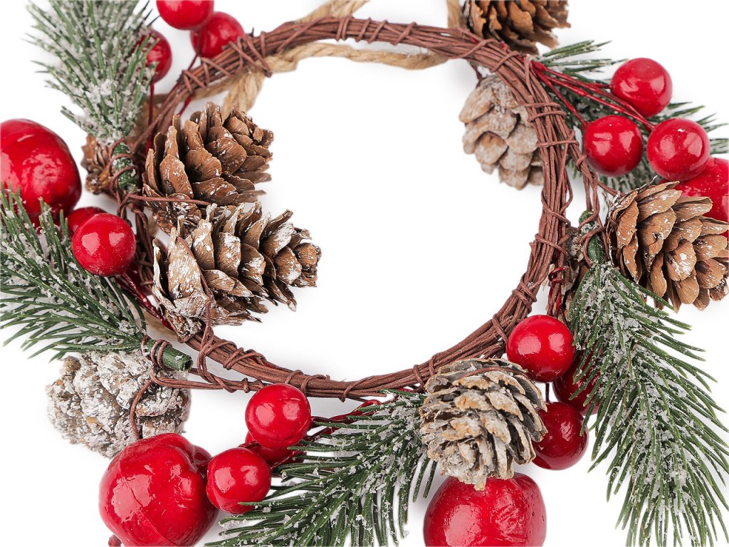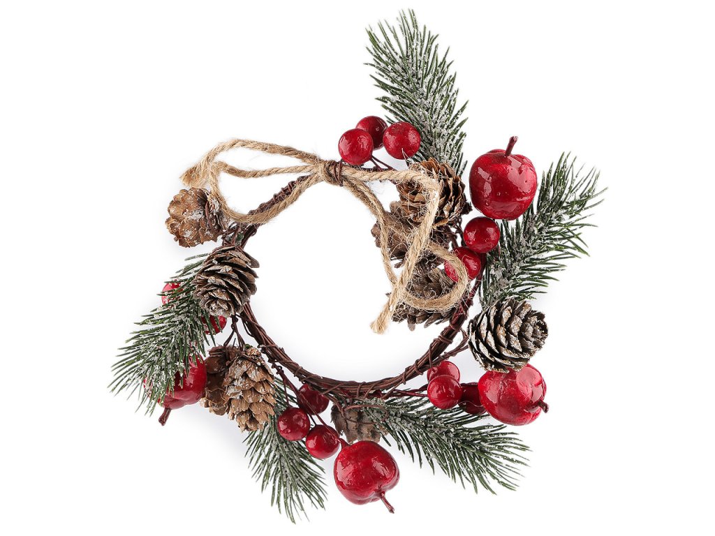 Malý dekorační věneček vám bude dělat společníka po celé zimní období. Zdobí ho umělé lehce zasněžené větvičky, bobule, jablíčka a přírodní šišky. Můžete ho pověsit na dveře, do okna, na krbovou římsu nebo na úchytky skříněk. Lze ho ale také naaranžovat na svíčku s průměrem maximálně cca 7 cm.