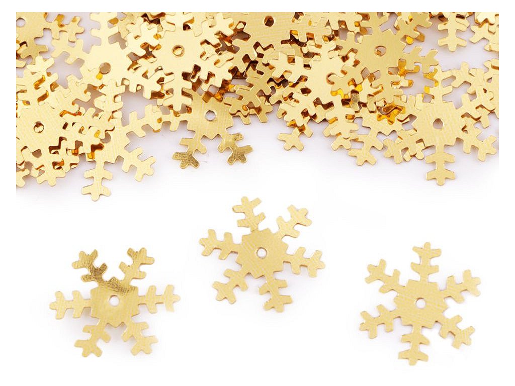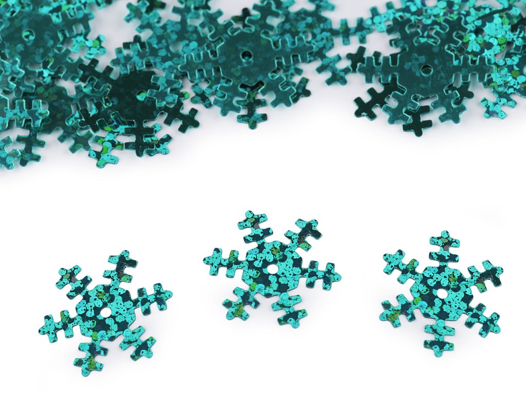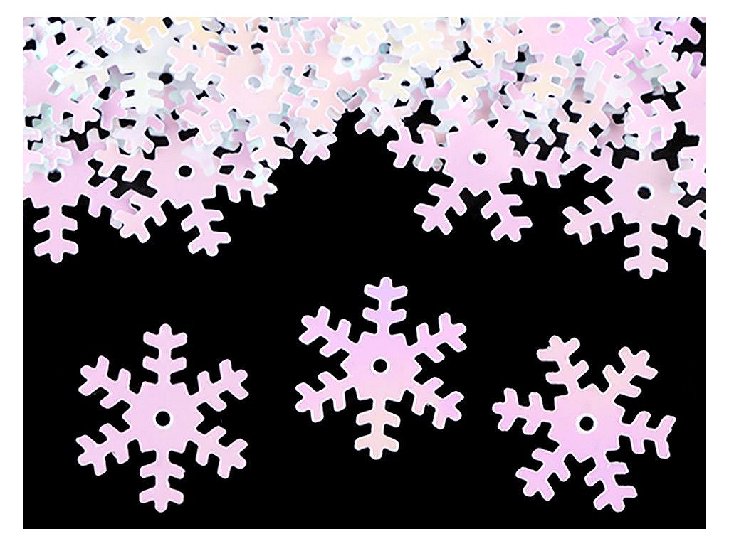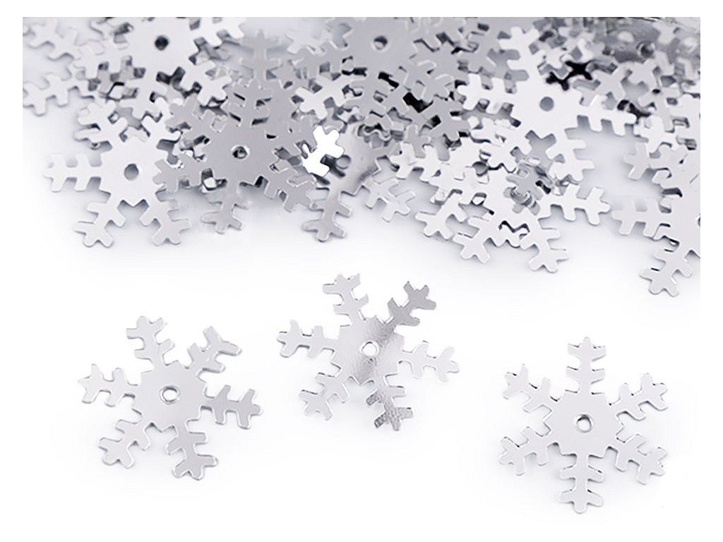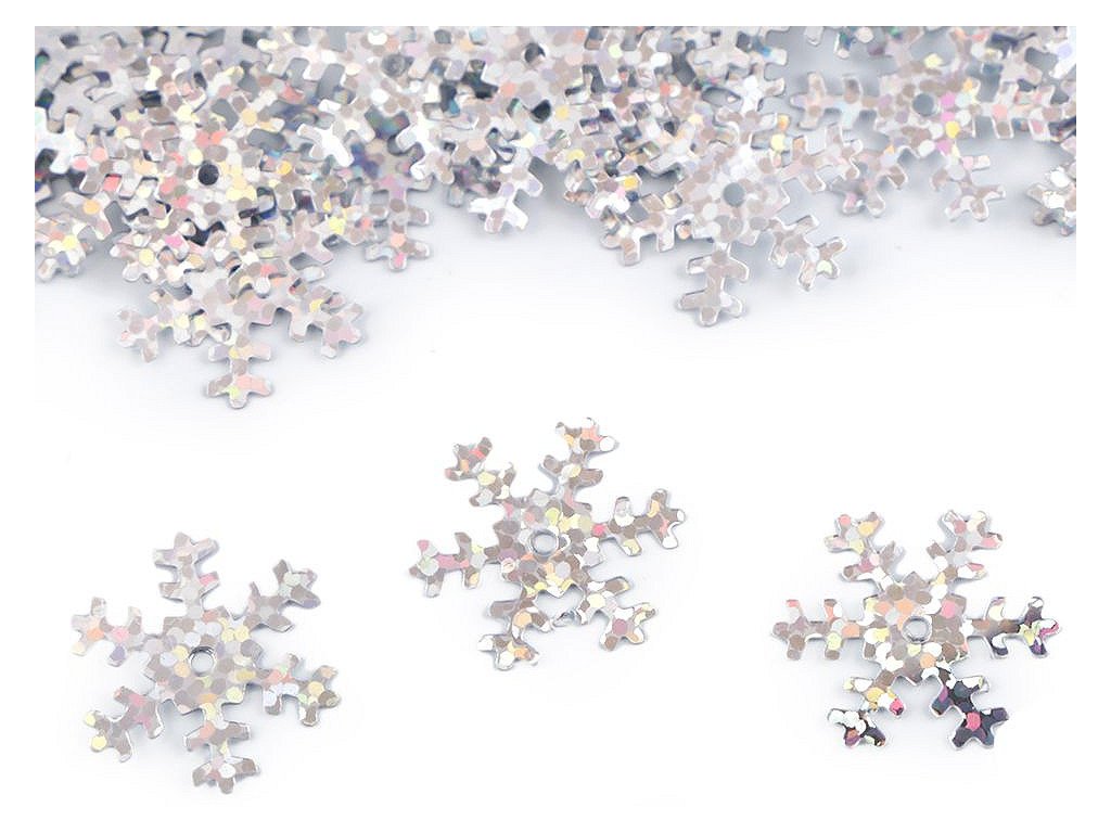 Hladké metalické flitry sněhové vločky. Vyniknou především u vánočních dekorací. Uprostřed mají otvor, jsou vhodné i na našití na oděvy a módní doplňky. Flitry s označením hologram se nádherně třpytí.
