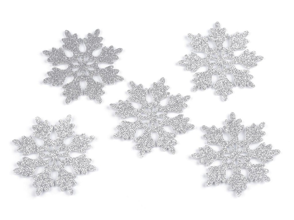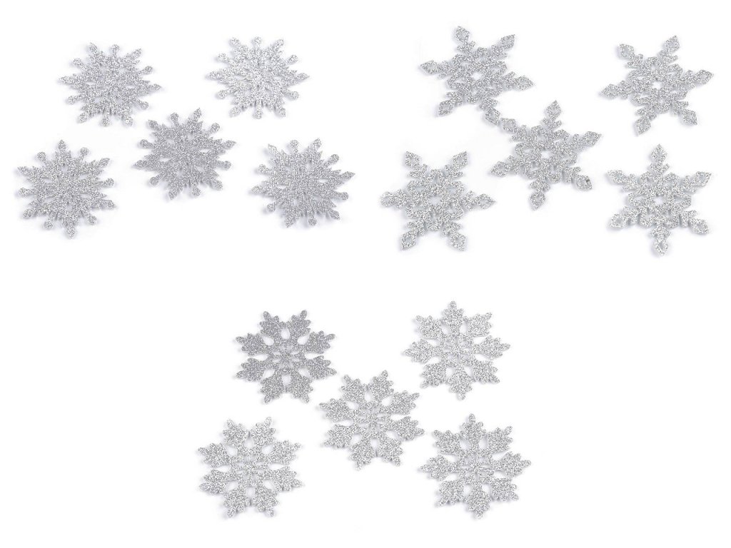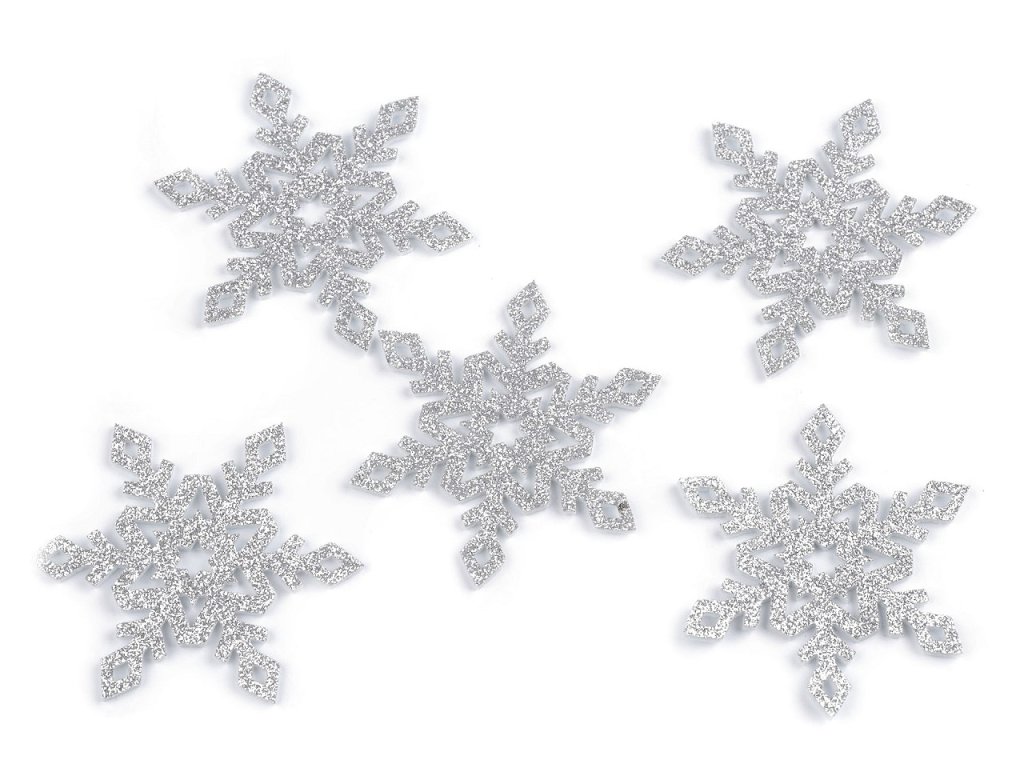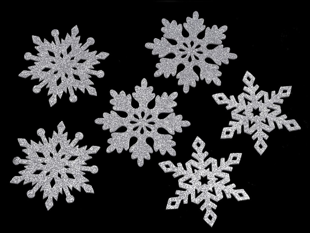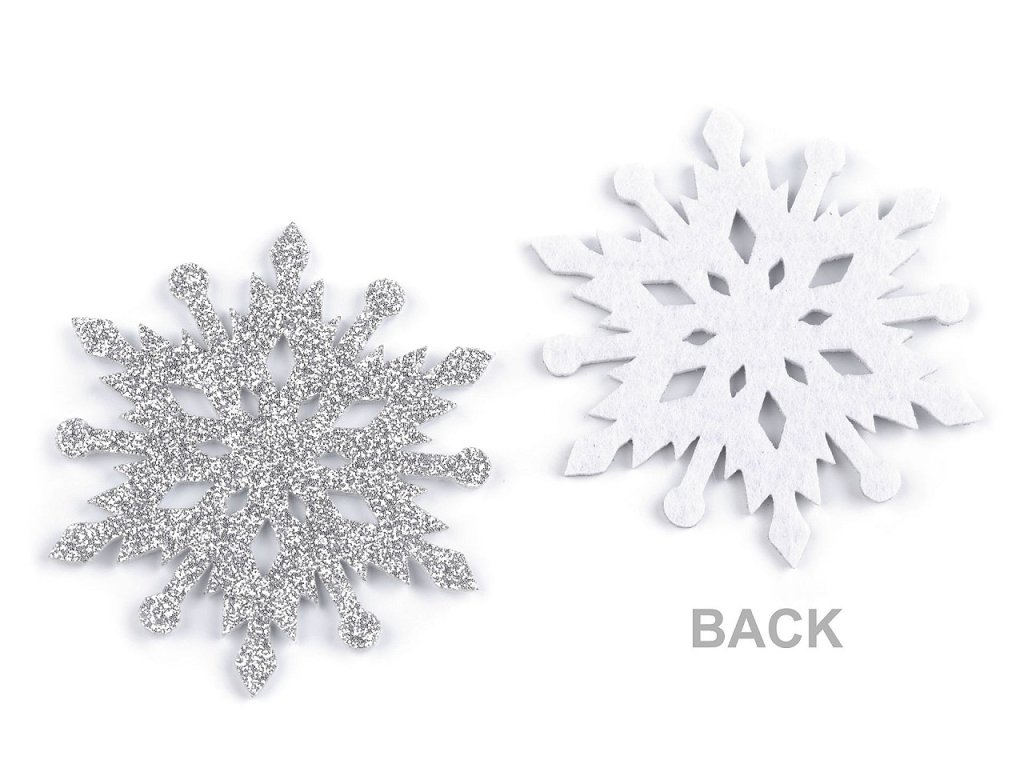 Filcové vločky zdobí z jedné strany třpytivé glitry. Druhá strana je filcová. Využijete je k aranžování, např. svátečního stolu, ale hodí se také na přilepení na vánoční věnce a podobné dekorace. Můžete jimi ozdobit i krabičky, květináče, truhlíky apod. Dají se pomocí šňůrky zavěsit jako ozdoba stromečku. Šňůrky nejsou součástí balení.