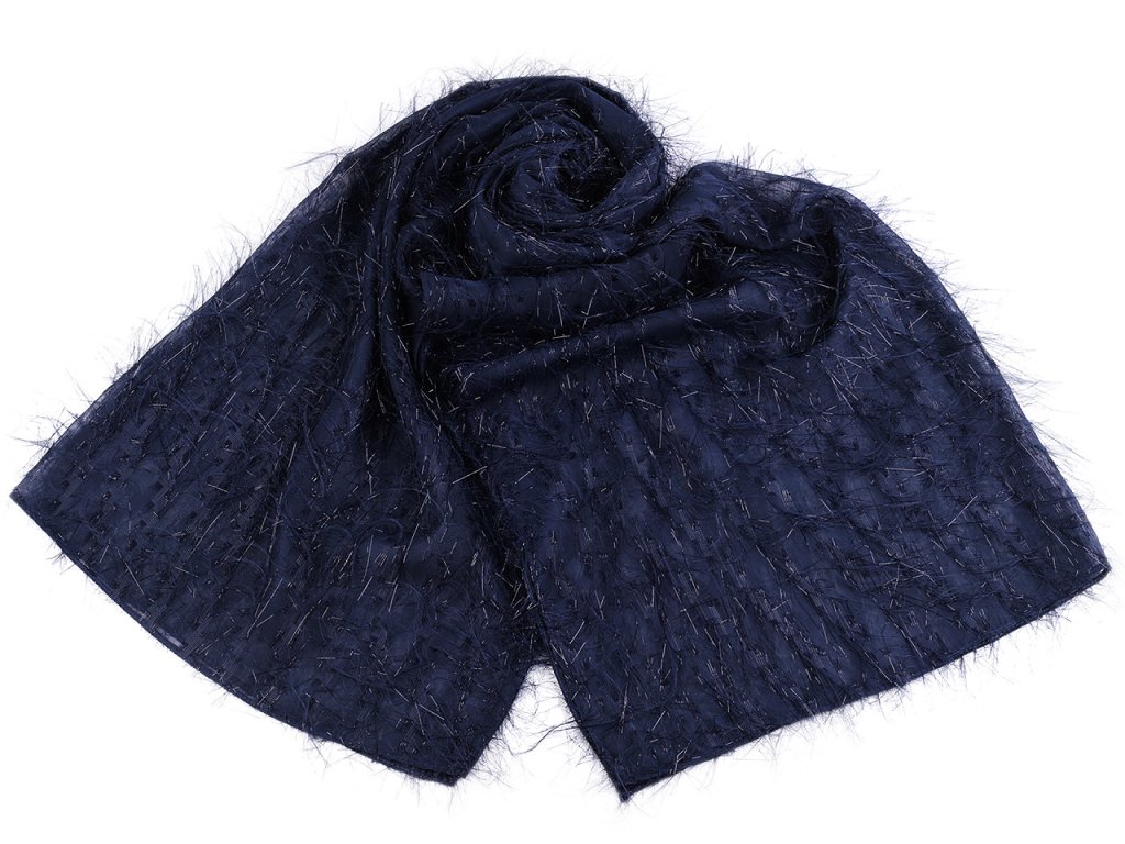 Společenský šifónový šál je velice elegantní. Je vzdušný a splývavý, poloprůsvitný. Díky lurexovými vláknům a ozdobným nitkám se jemně třpytí. S tímto společenským doplňkem budete středem pozornosti, působí velice luxusně, zdůrazní vaši krásu a výjimečnost.