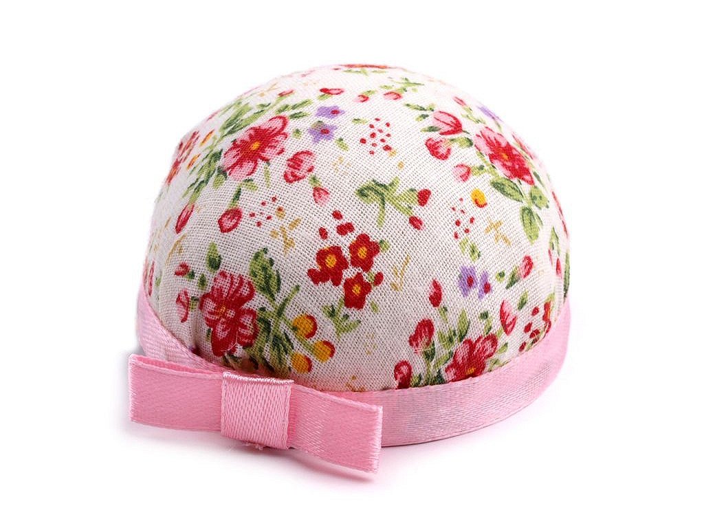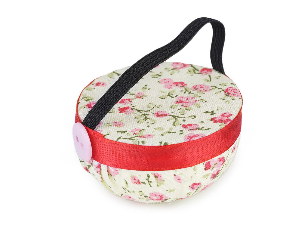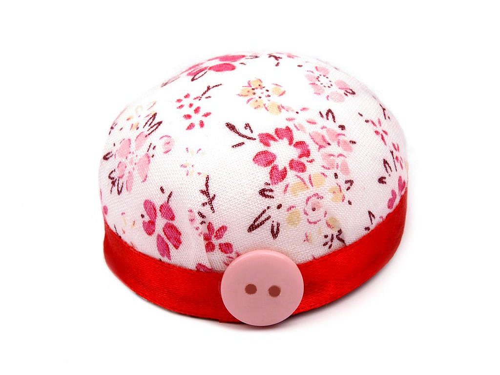 Praktický jehelníček ocení každý, kdo rád šije. Zdobí ho květinový vzor a knoflík. Jehelníček vám díky připevněné praktické pružence usnadní práci - můžete si ho navléct na ruku a jehly se špendlíky budete mít vždy po ruce.