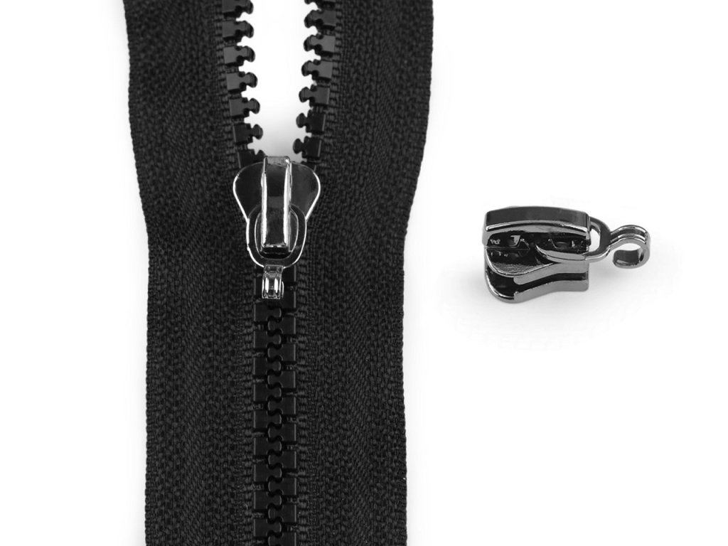 Kovový jezdec je určený ke kostěným zipům No 5. U nás sedí na zipy, které najdete pod kódem 090847, 900950, 900949, 900947, 090848. Jezdec je bez taháčku, má jen háček, na který si připevníte taháček dle vlastního vkusu či potřeby a pomocí kleští (které u nás najdete pod kódem 070813 nebo 090983) zamáčknete.