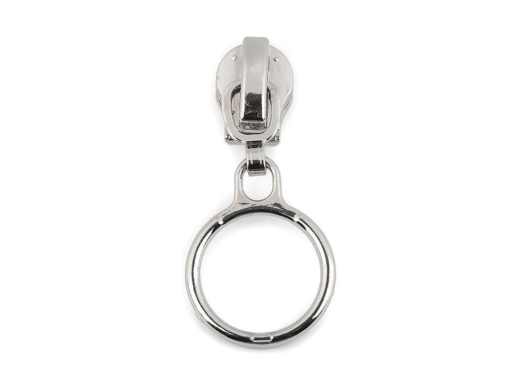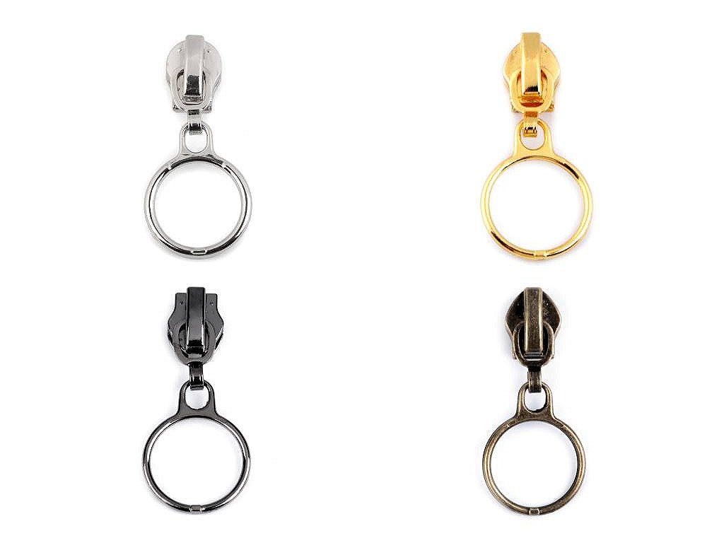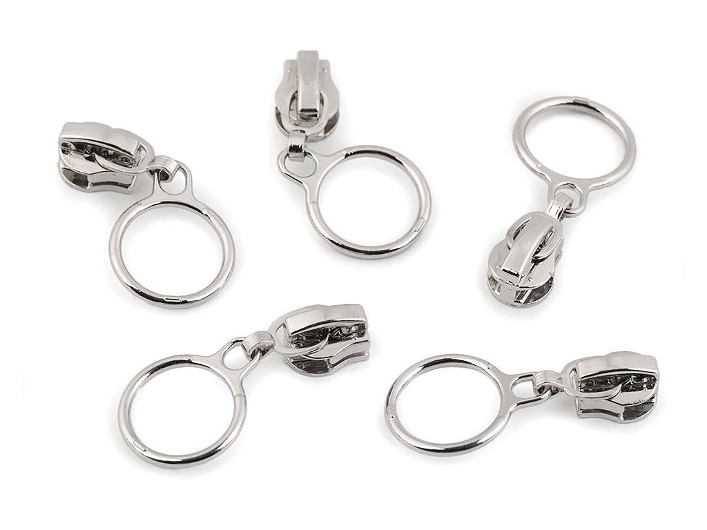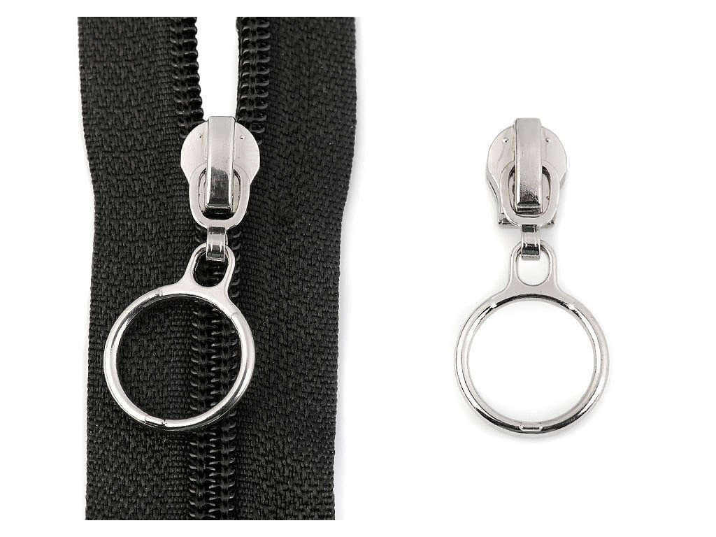 Kovový jezdec s táhlem v podobě kroužku je určený ke spirálovým zipům v metráži, které u nás najdete pod kódem 790304, 800963, 750994, 750503, 790305.