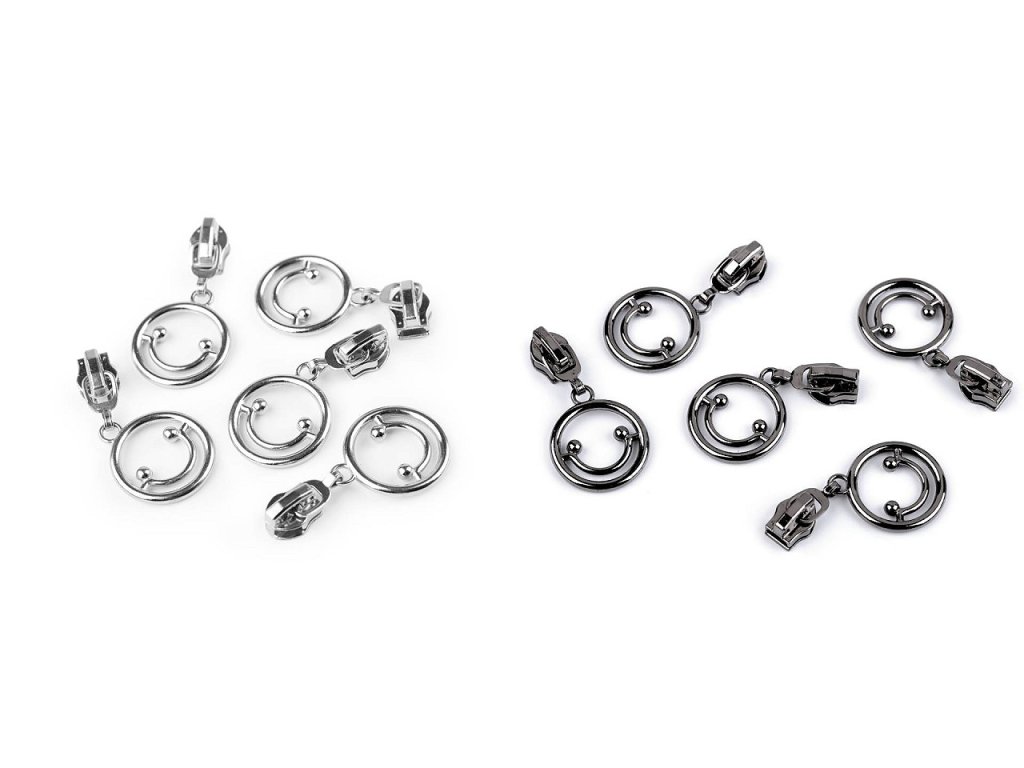 Kovový ozdobný jezdec má tvar smajlíka. Je s aretací, což znamená, že zip zůstává rozevřený pouze tolik, kolik si přejete.