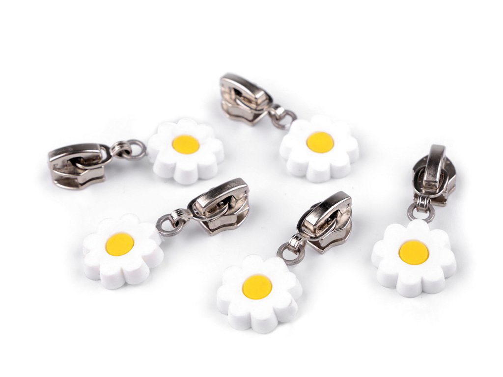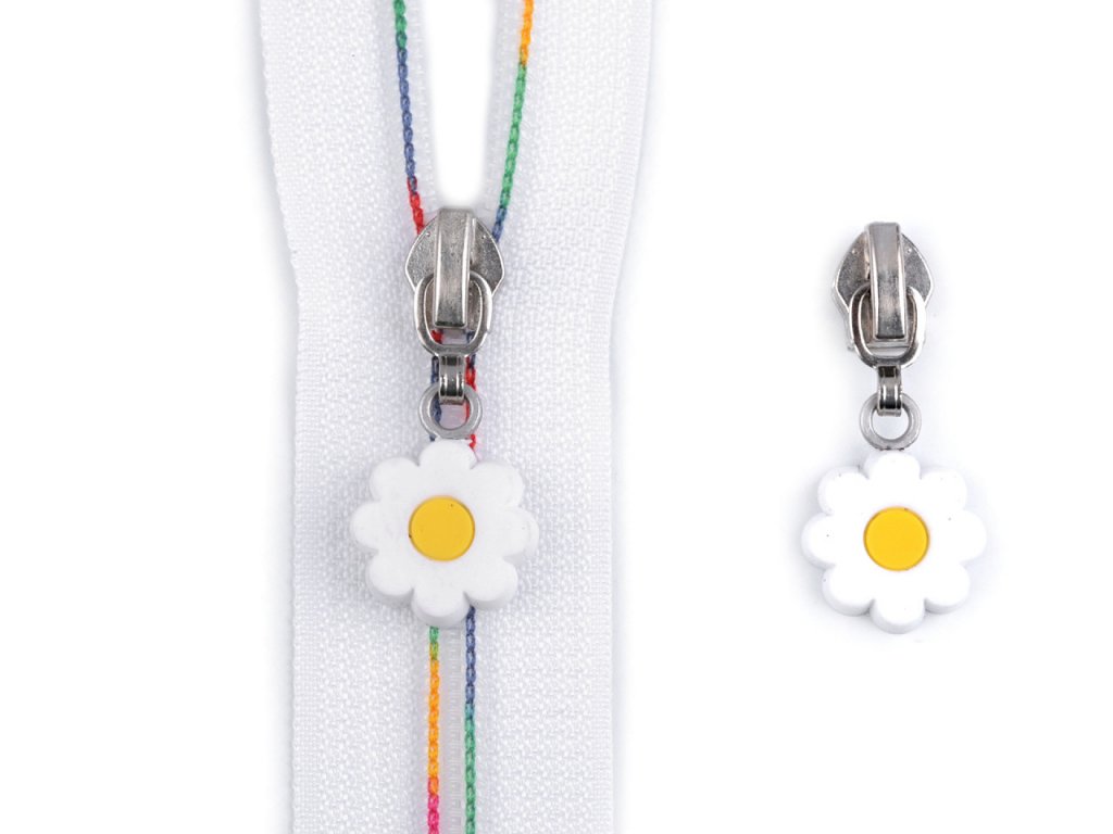 Kovový jezdec má silikonové táhlo ve tvaru květu. Je určený ke spirálovým zipům o šíři 6 mm v metráži, které u nás najdete pod kódy 750503, 790304, 800963.