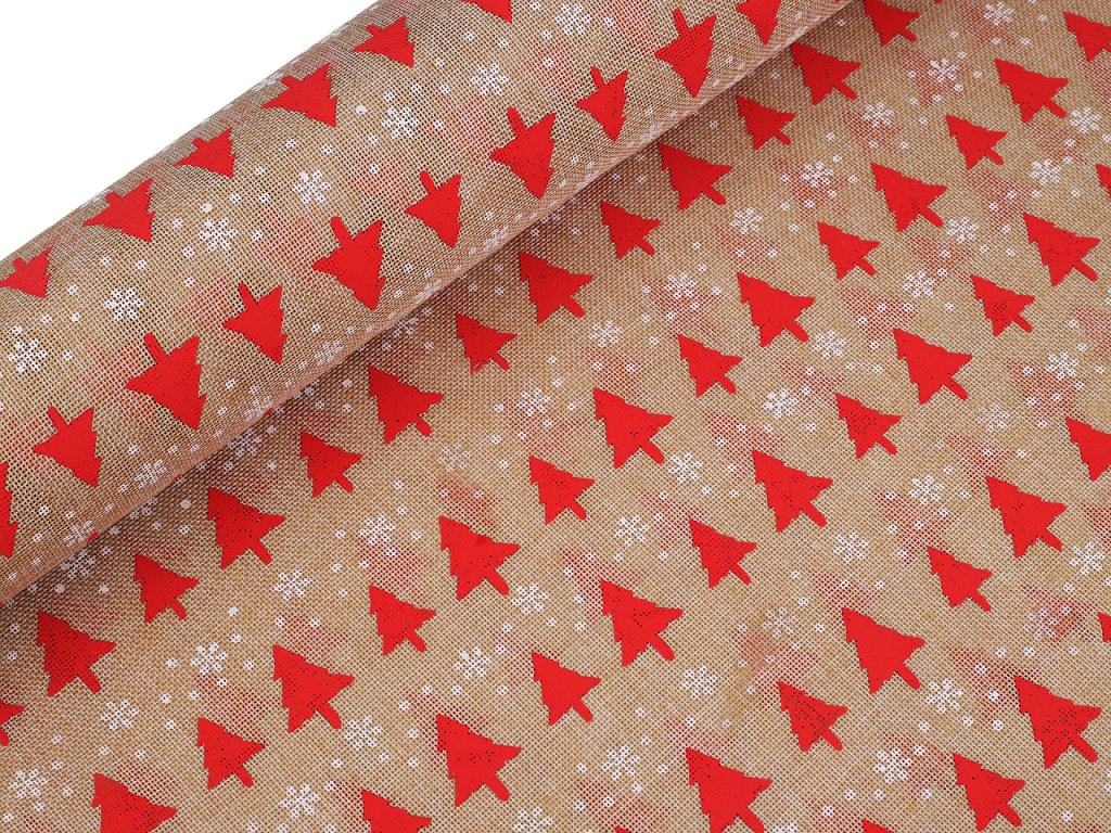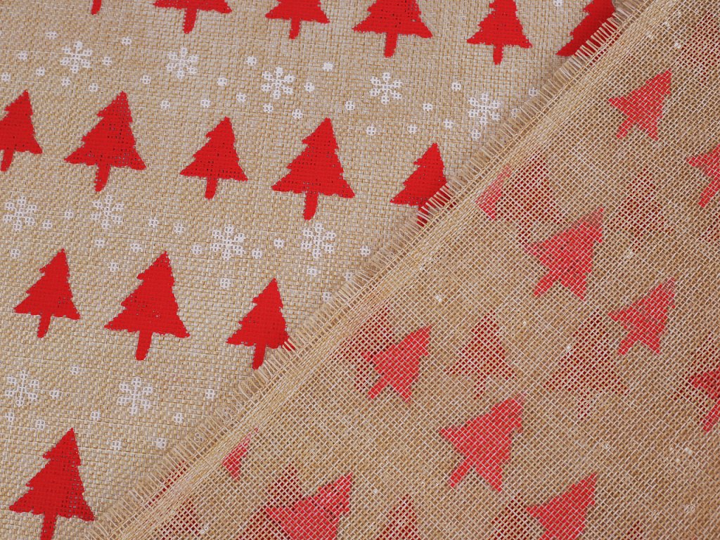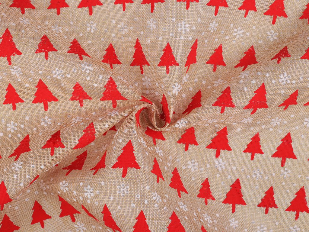 Imitaci juty zdobí potisk stromečků a sněhových vloček. Je lehká a pevná. Využijete ji na šití pytlíčků, ubrusů, prostírání nebo běhounů.