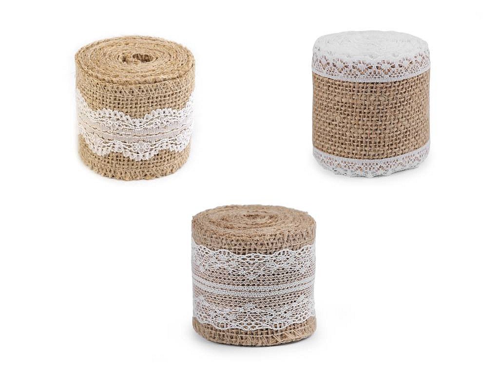 Jutovou stuhu zdobí uprostřed jemná romantická krajka, která stuze dodává vintage vzhled.