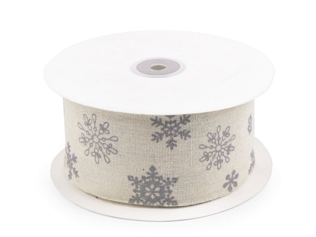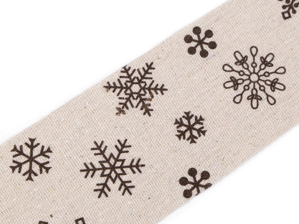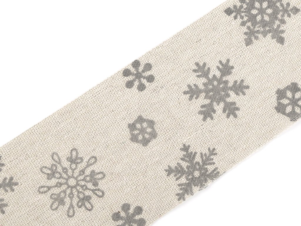 Široká lněná stuha s potiskem vloček je přírodní, má široké využití. Potisk je jednostranný.