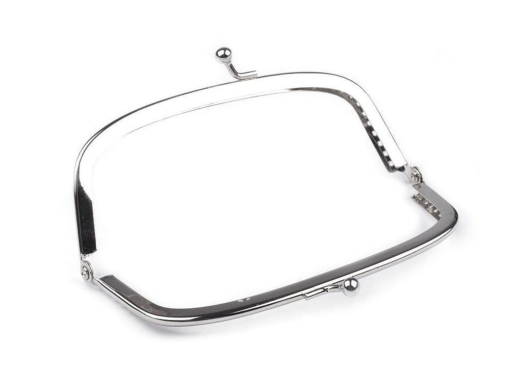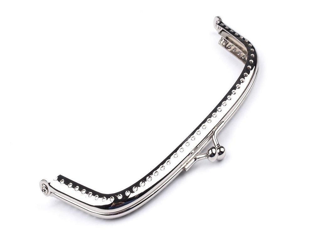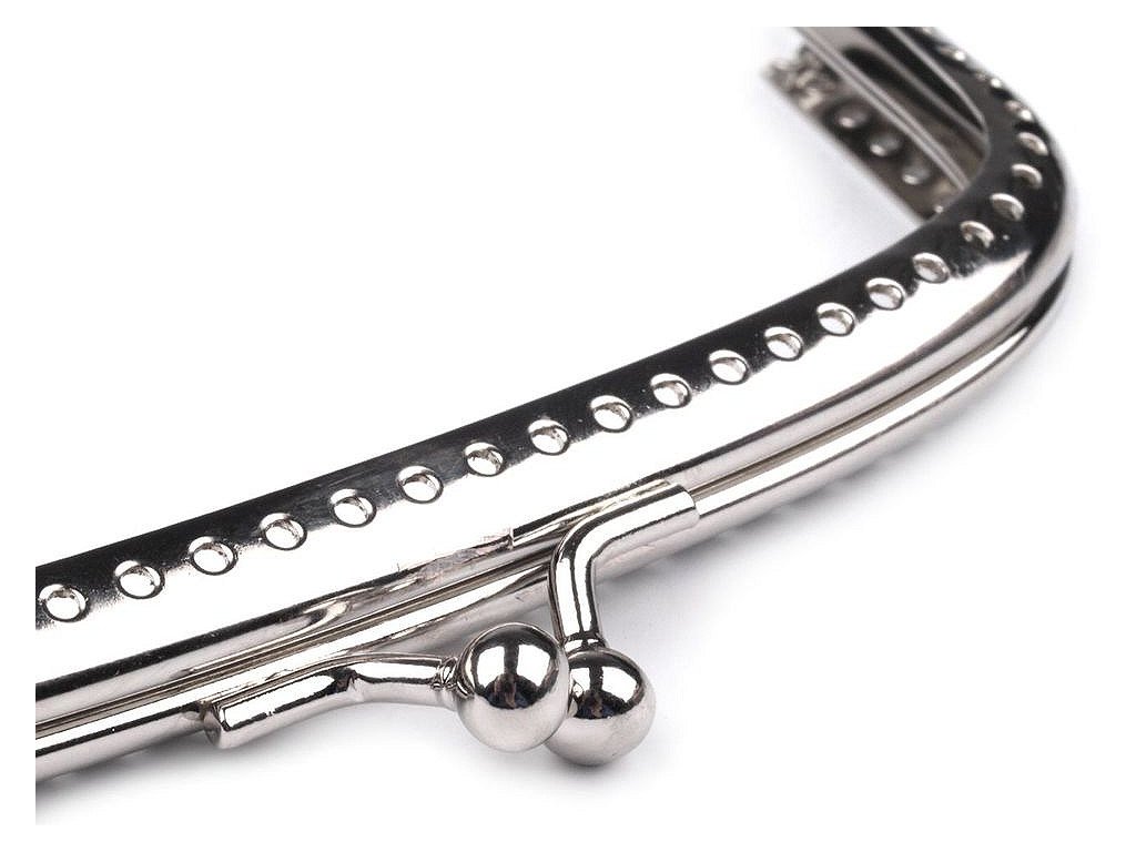 Rámeček se zapínáním na peněženky. Jde o našívací typ rámečku, kdy se látka dovnitř vloží a ručně přešije přes dírky na rámečku. Dírky jsou jen na vnější straně rámečku.