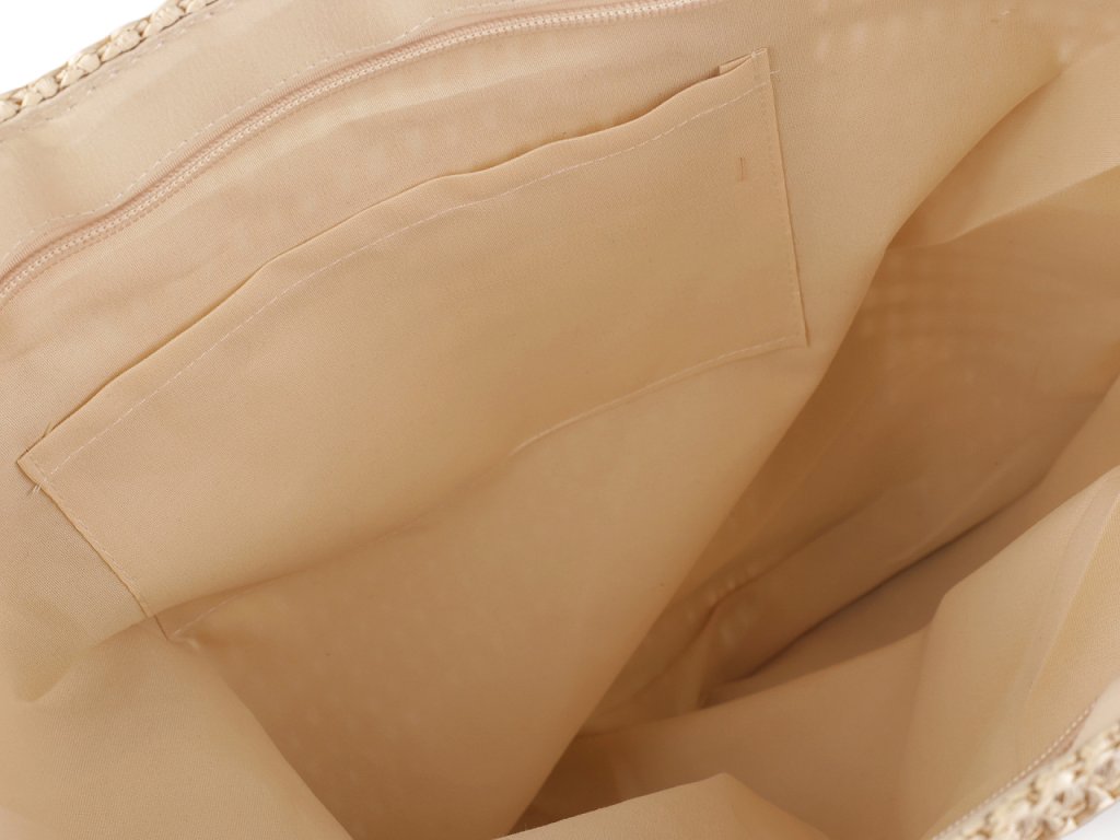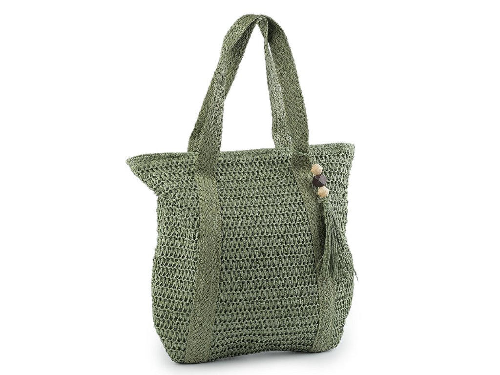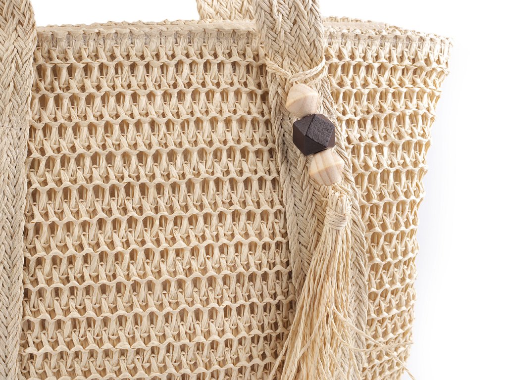 Velká háčkovaná kabelka s ozdobou střapce s dřevěnými korálky je zajímavým doplňkem v boho stylu. Je vyrobená z papírových provázků z palmy rafie, díky tomu je lehká jako peříčko. Decentní vzor háčkování vytváří nadčasový vzhled, který se hodí k různým příležitostem, bude krásným doplňkem vašeho letního outfitu. Uzavírá se na zip, uvnitř má dostatečně velký prostor i na větší věci. Má dvě ucha do ruky a uvnitř malou kapsičku na drobnosti.
