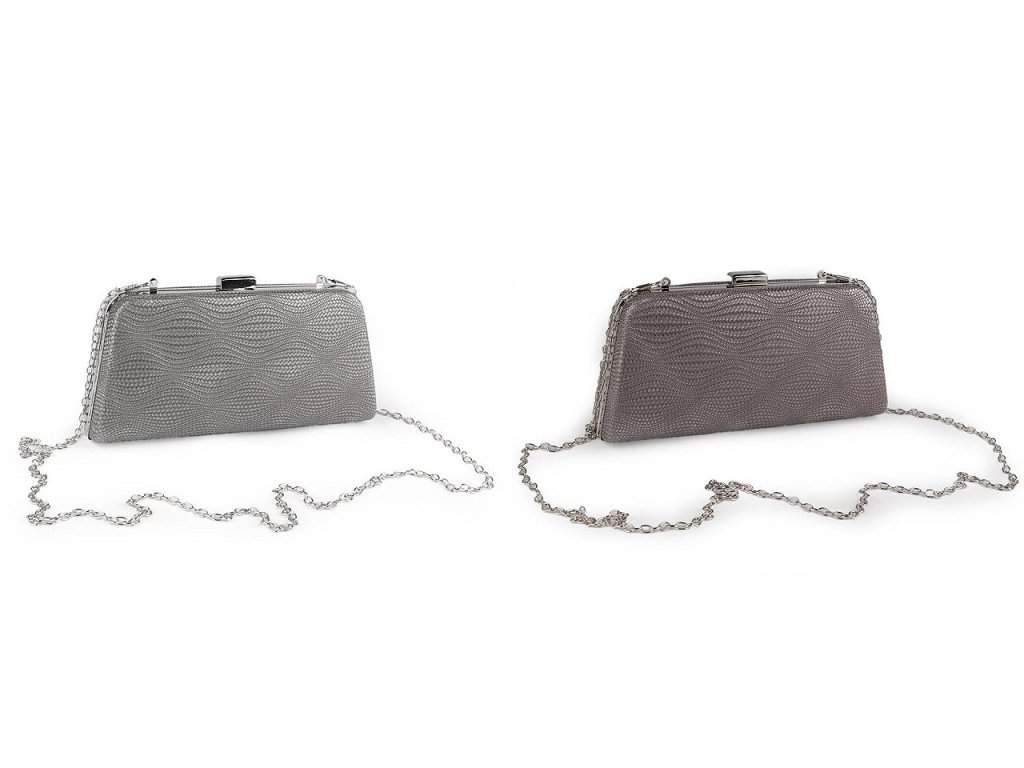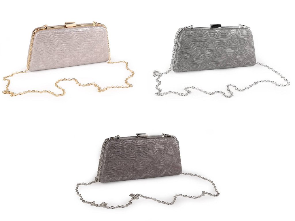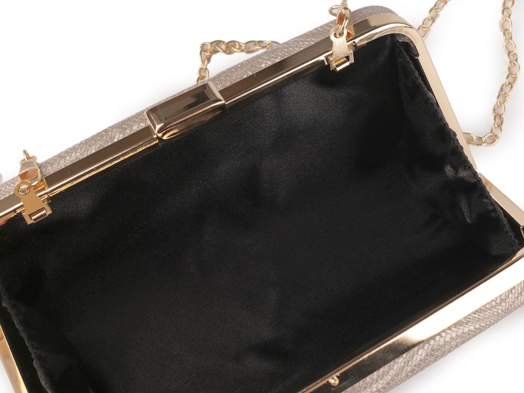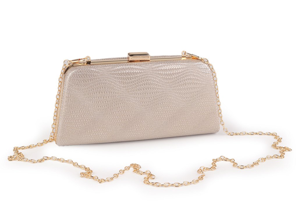 Malá společenská kabelka vyzařuje eleganci a luxus, má zajímavou lesklou povrchovou strukturu, efektně se třpytí. Zdobí ji výrazné lesklé zapínání a rámeček po celém obvodu. Kabelka je pevně vyztužená, její součástí je dlouhý odnímatelný řetízek na karabiny. Můžete ji nosit v ruce nebo jako crossbody přes rameno či do kříže.