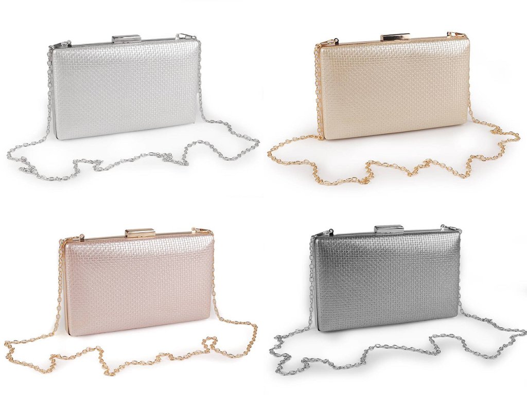 Malá společenská kabelka vyzařuje eleganci a luxus, má metalický lesk. Povrch má zajímavou kostičkovou strukturu. Zdobí ji výrazné lesklé zapínání a rámeček po celém obvodu. Kabelka je pevně vyztužená, její součástí je dlouhý odnímatelný řetízek na karabiny. Můžete ji nosit v ruce nebo jako crossbody přes rameno či do kříže.
