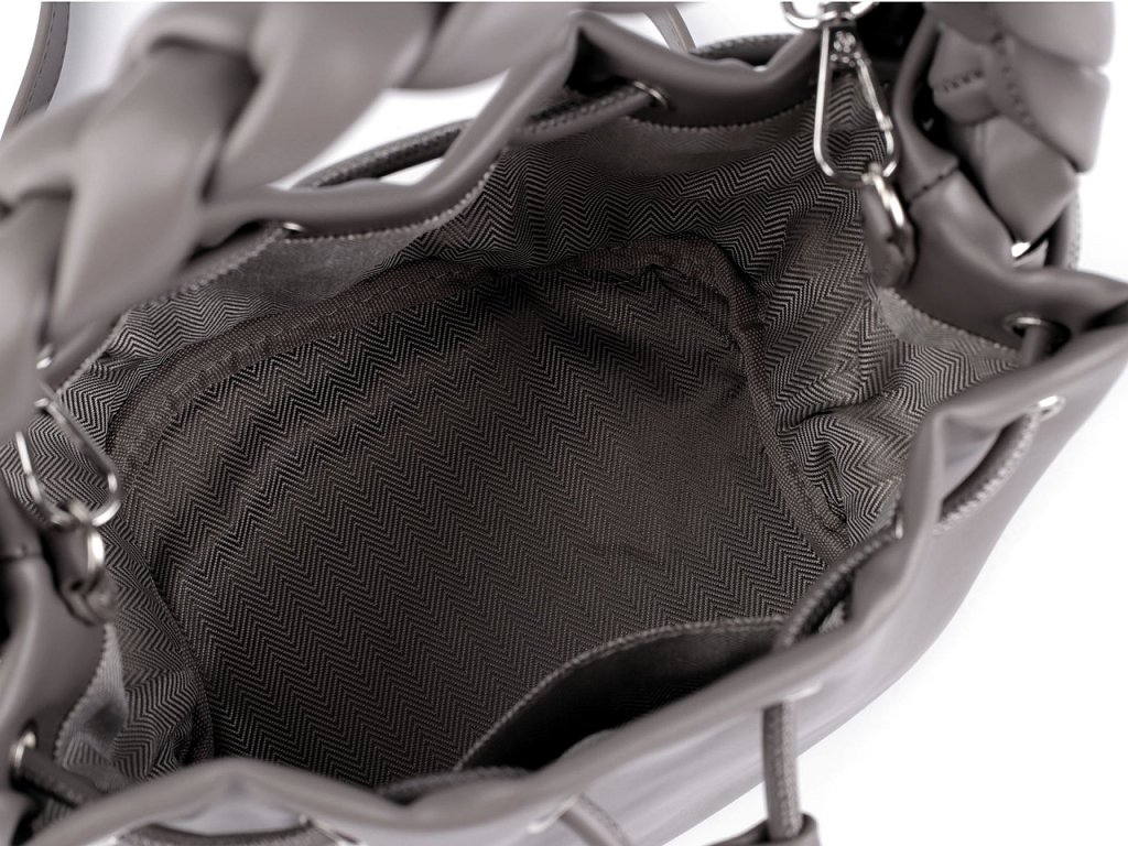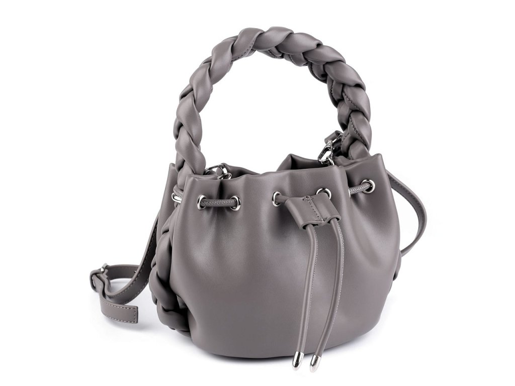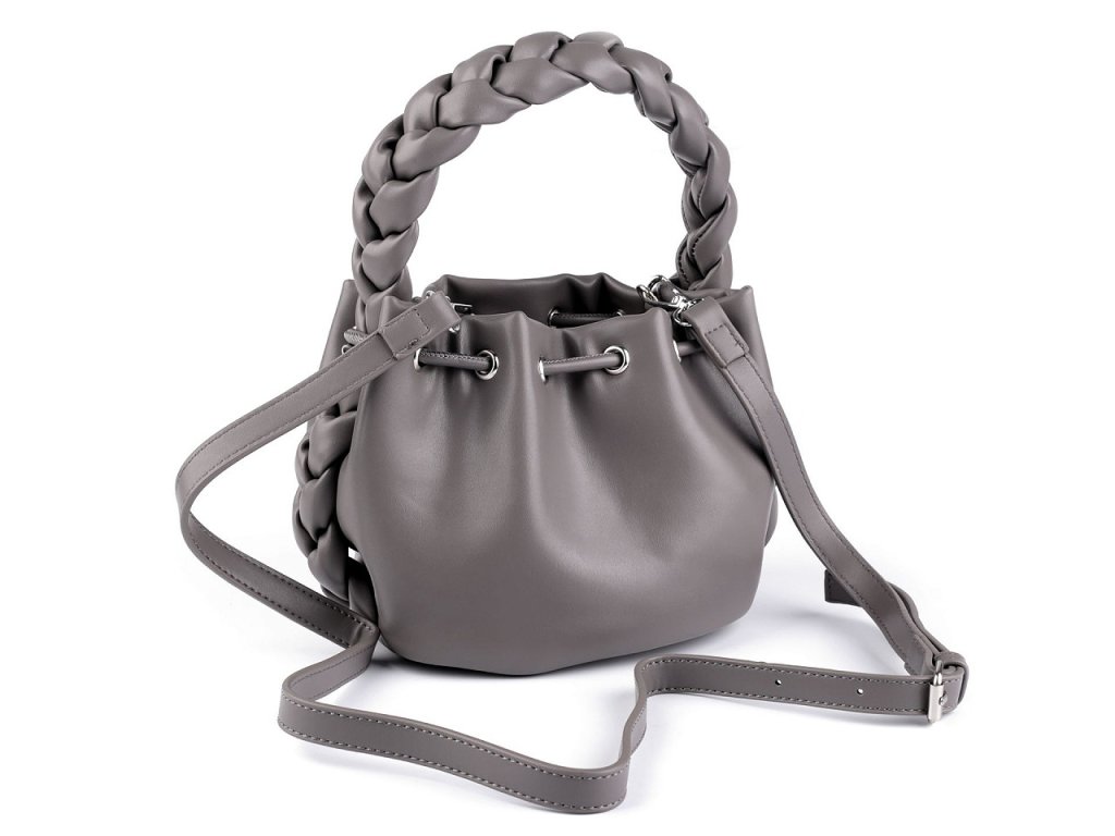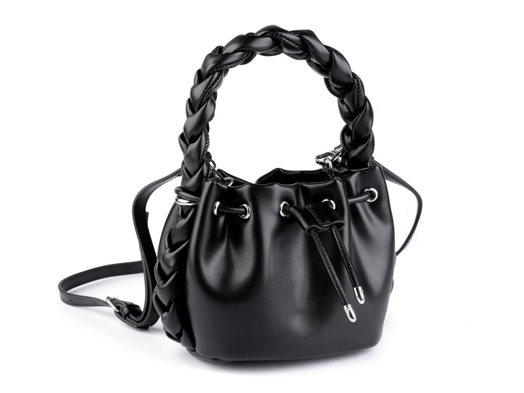 Módní kabelka má zájímavý design se stahovacím uzavíráním. Zaujme především svým robustním spleteným uchem do ruky. Uvnitř se nachází malá plochá kapsa, dno má oválný tvar. Díky svému elegantnímu vzhledu se kabelka stane skvělou společnicí nejen při společenských událostech, ale i při každodenním nošení. Je vyrobená ze syntetického materiálu, který vypadá jako kůže. Součástí kabelky je i odnímatelný popruh na karabiny s regulací délky v podobě opaskového zapínání.
