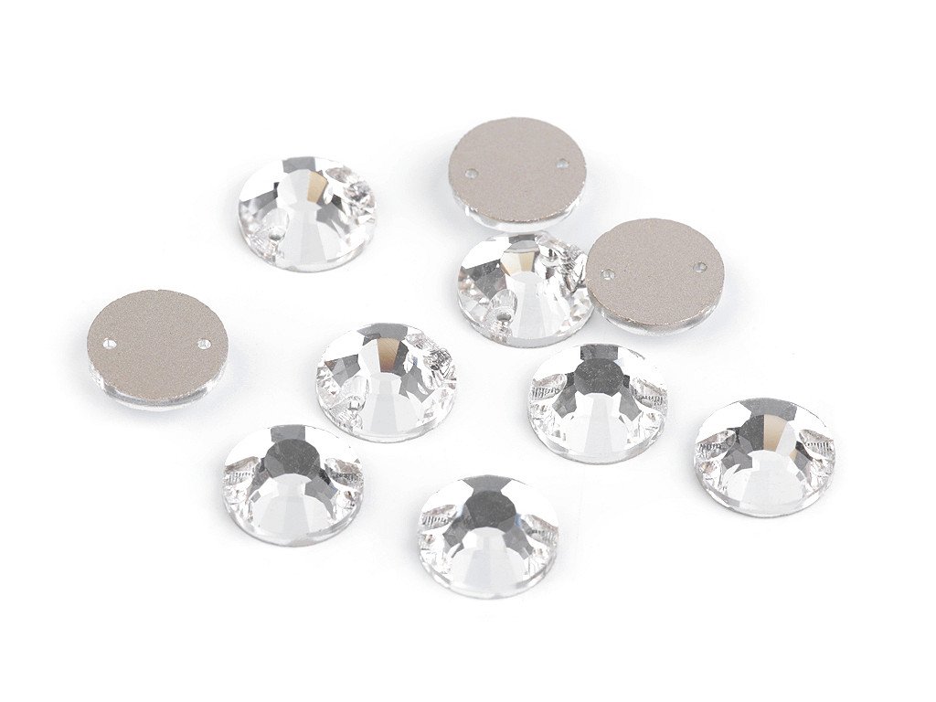 Broušené skleněné kamínky se díky precizního výbrusu efektně třpytí. V každém kamínku jsou dva otvory, které umožňují snadné našívání. Na rubové straně jsou opatřeny krycí barvou, která zabraňuje zbarvení dle přiloženého podkladu. Oceníte je při výrobě šitých šperků nebo zdobení oděvů. Kamínky oslnivě vyniknou na společenských šatech, halenkách a doplňcích, jako jsou kabelky, psaníčka, klobouky apod.