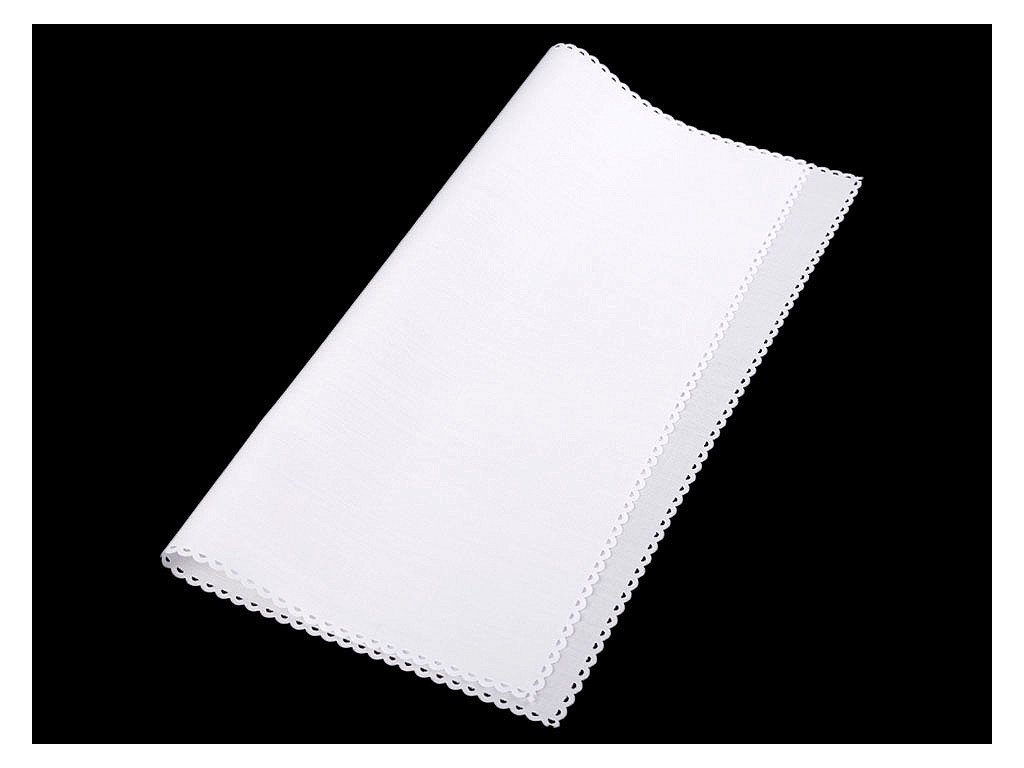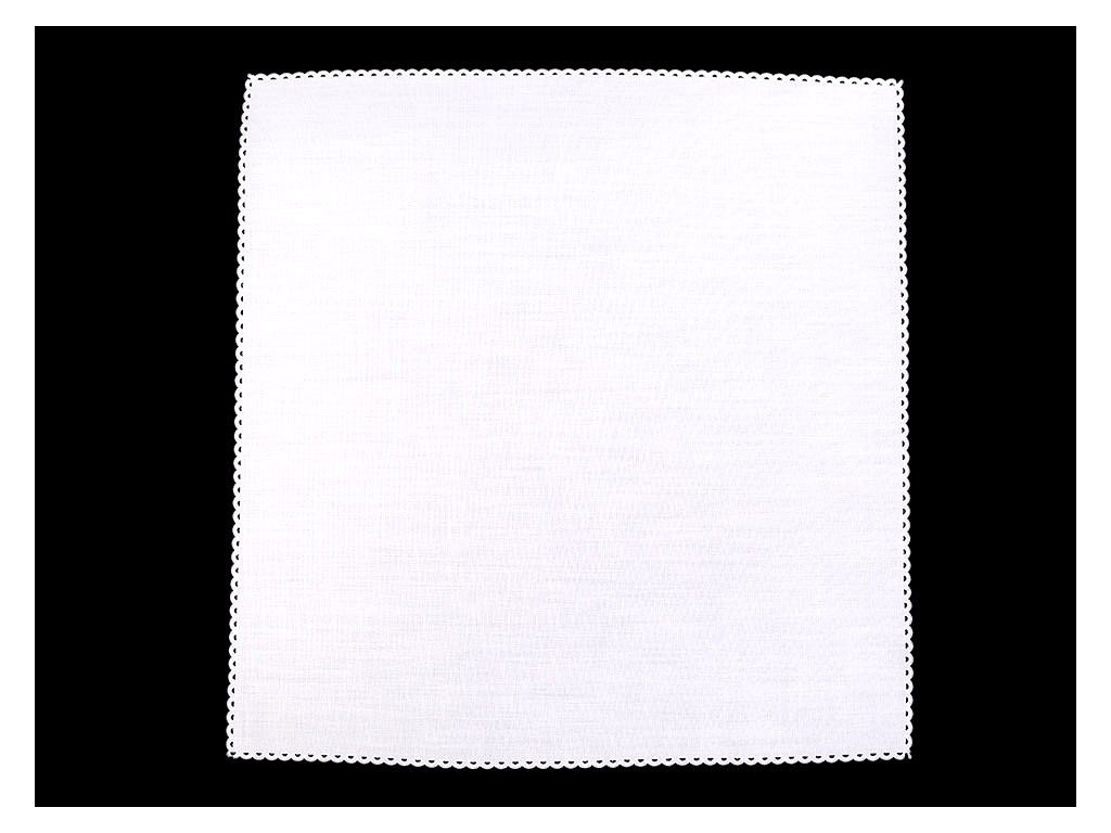 Okraje má ozdobně lemované drobnými obloučky a perforací.