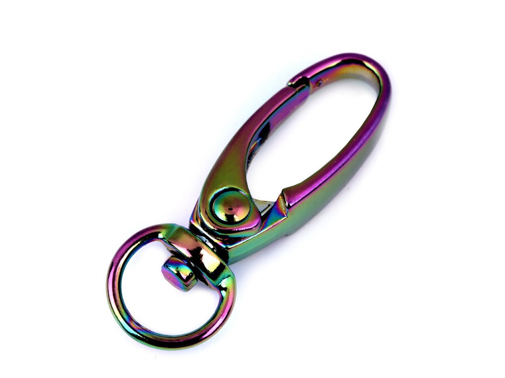 Kovová karabina má efektní holografický povrch, který hází zajímavé odstíny. Využijete ji na upevnění popruhů k taškám a kabelkám. Je otočná.