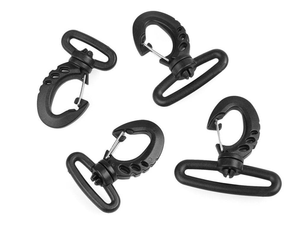 Plastová karabina je vhodná na popruhy ke sportovním taškám, batohům nebo větším kabelkám. Má nízkou hmotnost a je otočná.