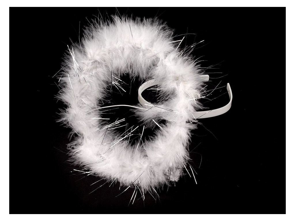 Svatozář je k plastové čelence připevněná pomocí bílých drátů. Díky nim si ji můžete natáčet a tvarovat do různých poloh. Samotná aureola je vyrobená z drátu potaženého péřovou girlandou, ve které jsou vetkané stříbrné lamely. Díky nim se nebesky třpytí.