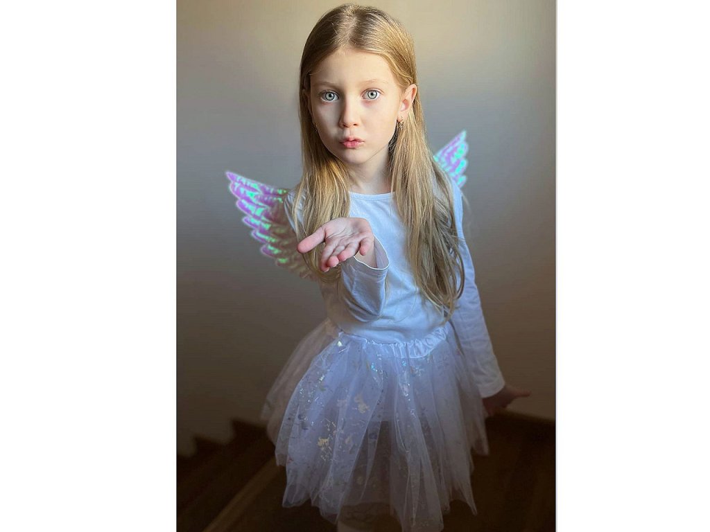 S karnevalovým kostýmem se každá malá slečna promění v anděla i jednorožce, záleží jen na její fantazii. Kostým se skládá z tylové sukýnky a křídel. Sukýnka je ozdobená duhovým metalickým potiskem, v pase je pružná. Křídla jsou oboustranná, mají nádherné metalické odlesky, nasazují se pomocí gumiček.