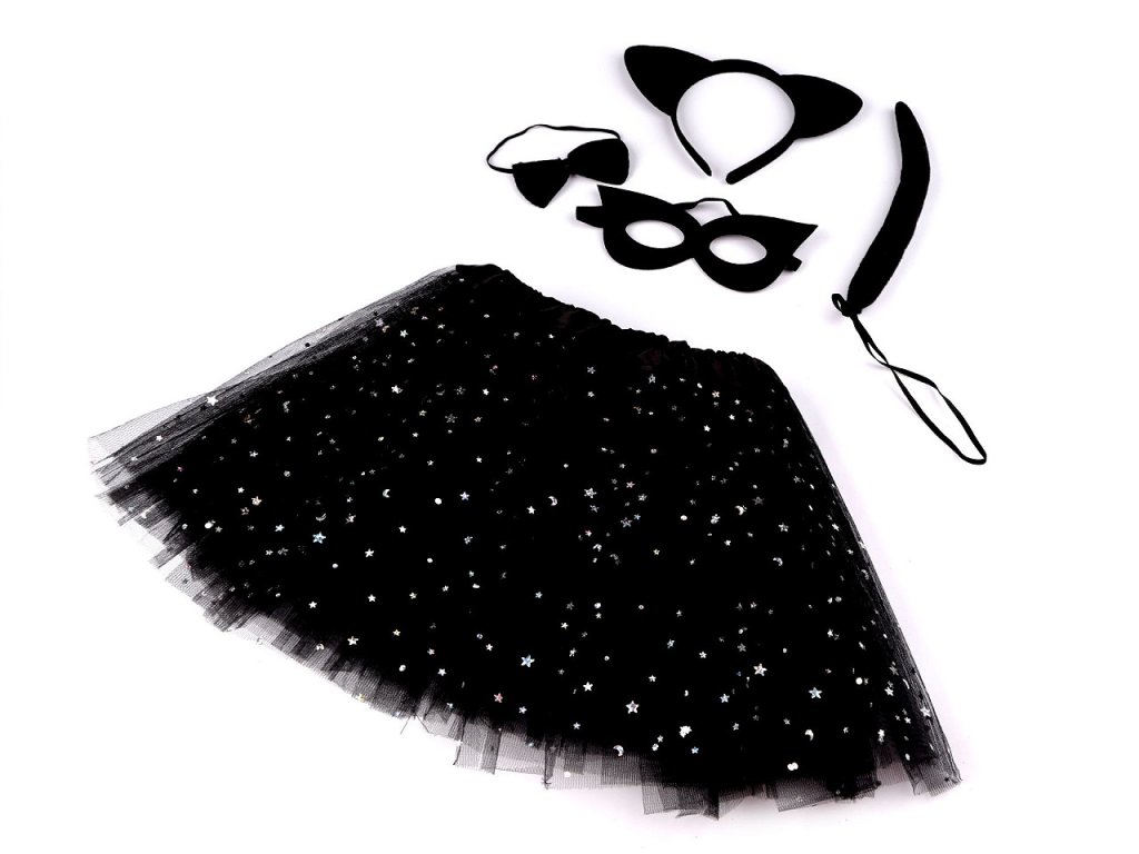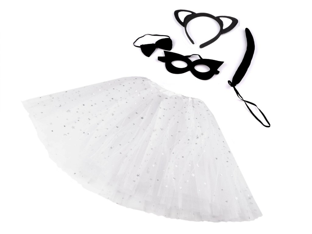 Kostým roztomilé kočičky okouzlí každou malou holčičku. Skládá se z tylové sukýnky, ocásku, mašle kolem krku, škrabošky a čelenky s ušima. Doplňky jsou z jemného plyše.