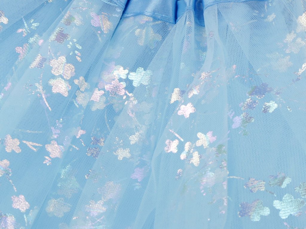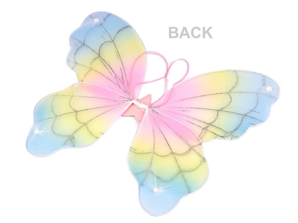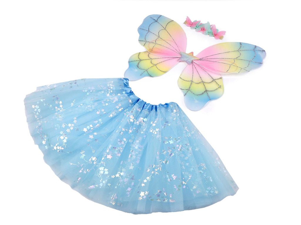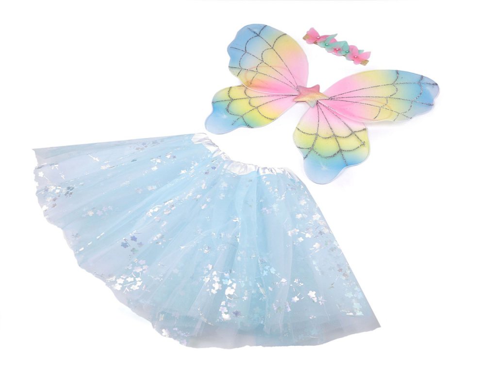 S karnevalovým kostýmem se každá malá slečna promění v nádherného motýla. Kostým se skládá z tylové sukýnky, křídel a čelenky. Sukýnka je ozdobená duhovým metalickým potiskem, v pase je pružná. Křídla jsou oboustranná, vyztužená drátěnou kostrou, ozdobená glitrovými detaily. Ve středu mají hvězdu s glitry, nasazují se pomocí gumiček. Čelenka je pružná, ozdobená textilními motýly s perlami.