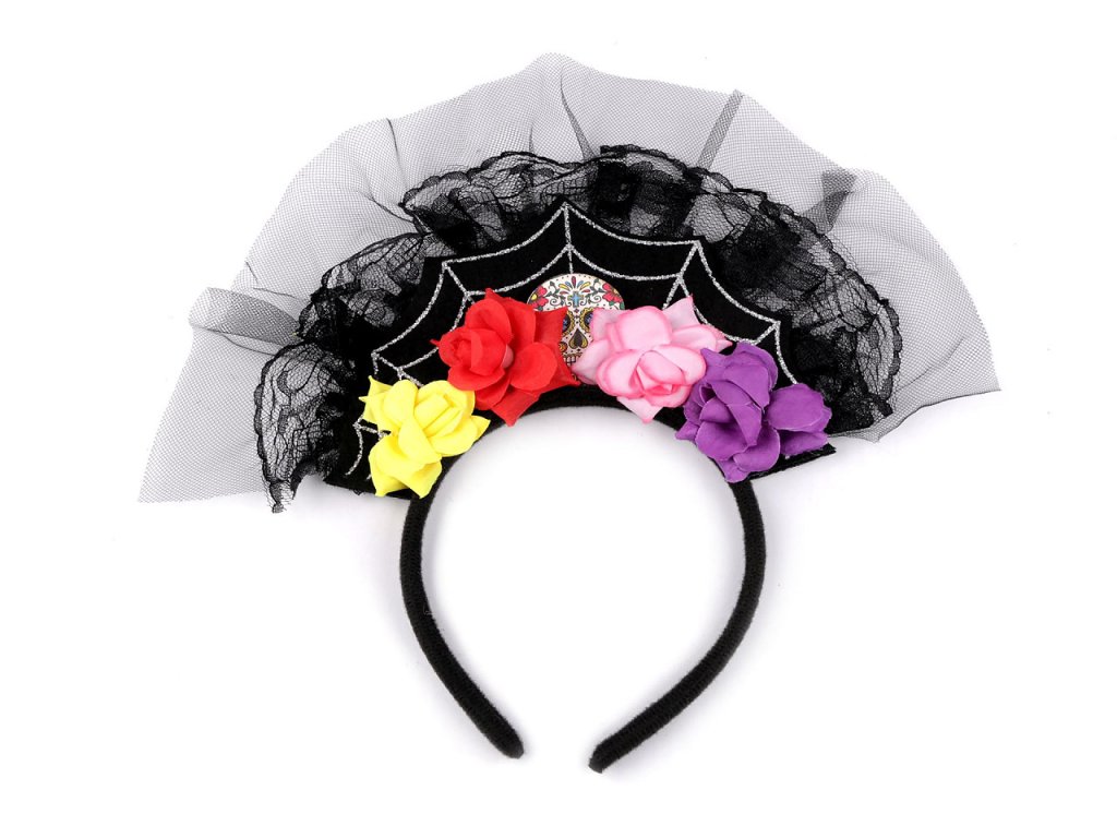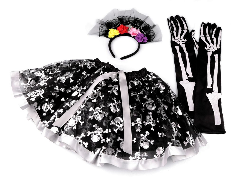 Strašidelný kostým se skládá z tylové sukně, působivé čelenky (s tylem, krajkou a květy) a z rukavic. Sukýnka má na sobě metalický potisk lebek. Kostým je vhodný pro větší školní děti.