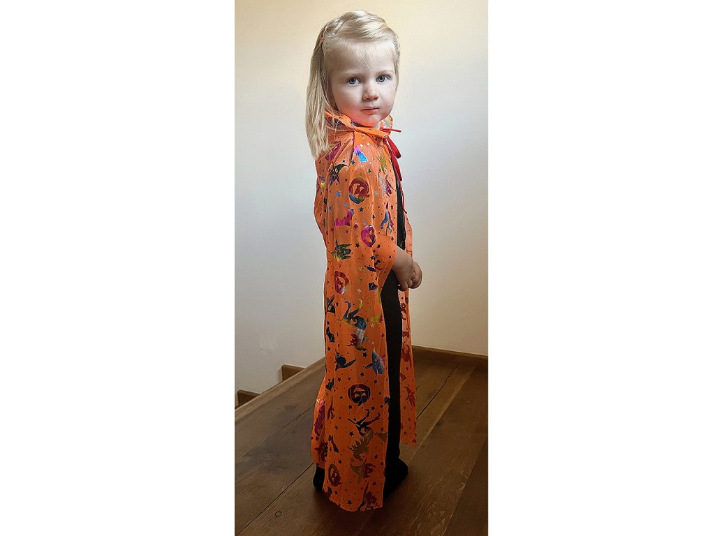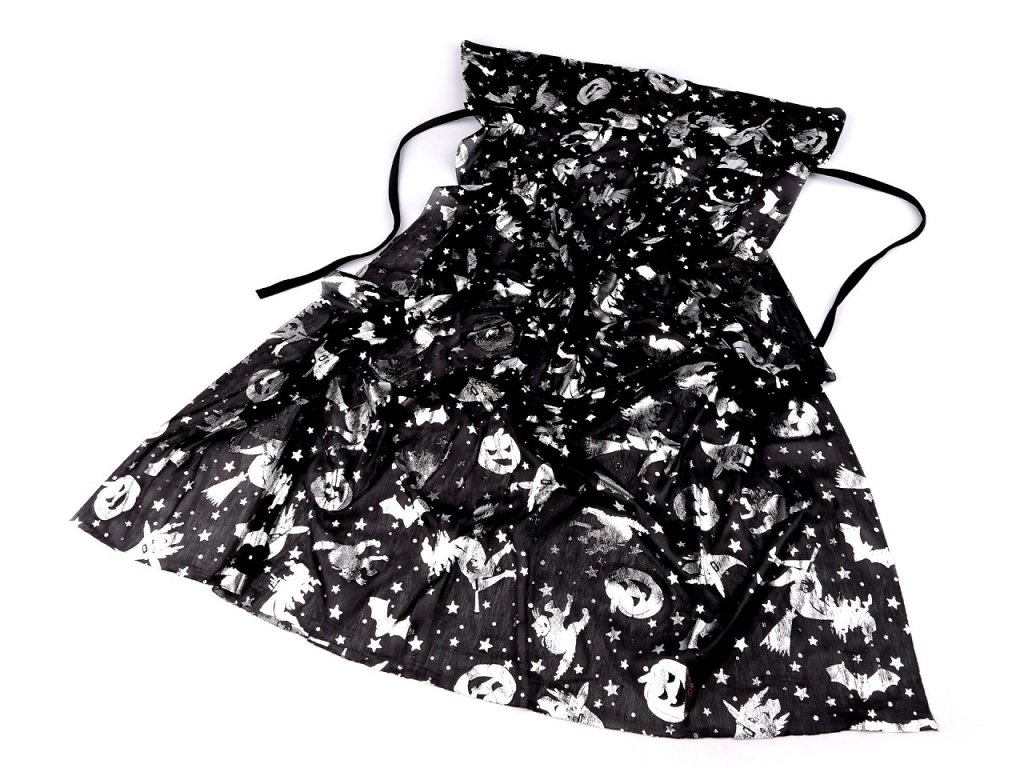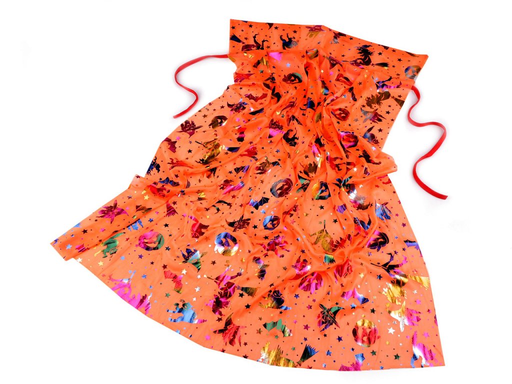 Karnevalový plášť má efektní metalický potisk. Promění vaše dítko v čaroděje, ježibabu, kouzelníka a podobné strašidelné postavy. Váže se pomocí šňůrek. Materiál je poloprůhledný.