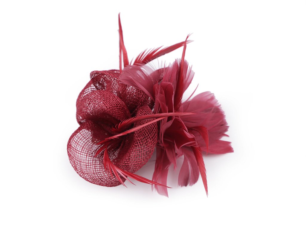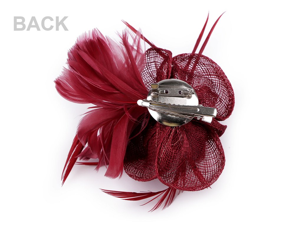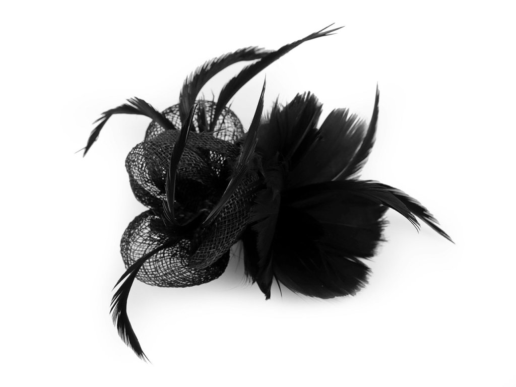 Noblesní fascinátor s peříčkovým květem ibišku využijete na společenské akce jako jsou plesy, svatby či návštěvy divadla. Dá se připnout i jako zajímavá brož. Květy jsou tři, jeden je z peří, další jsou vyrobené z modistické síťky, střed mají zkrášlený pírky.