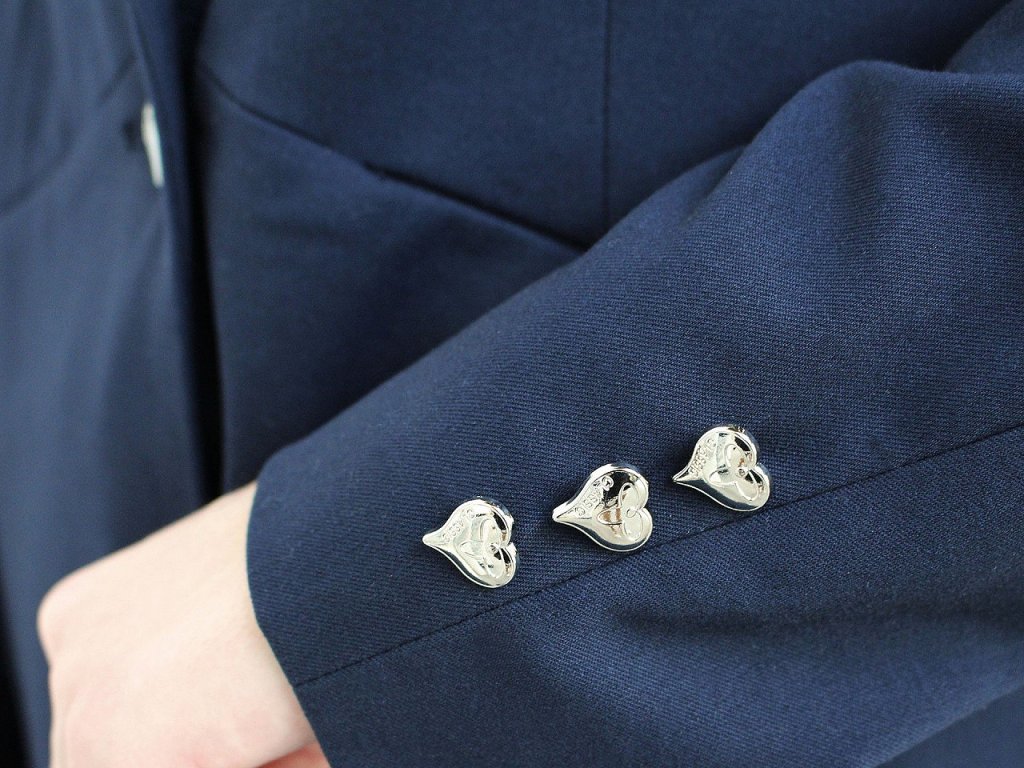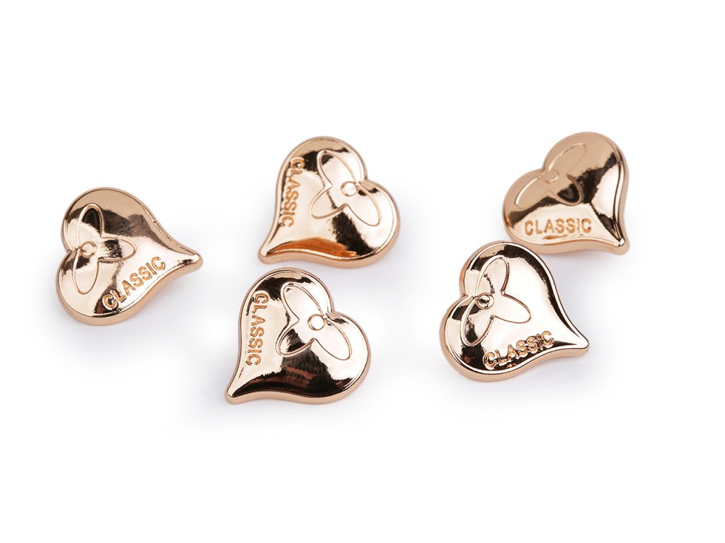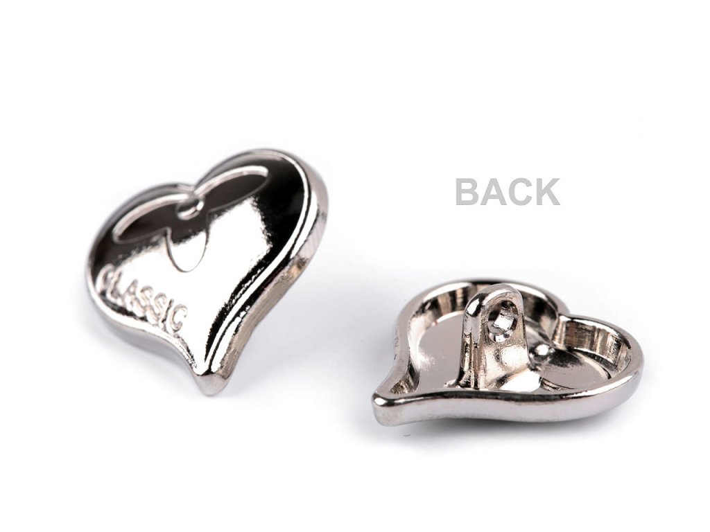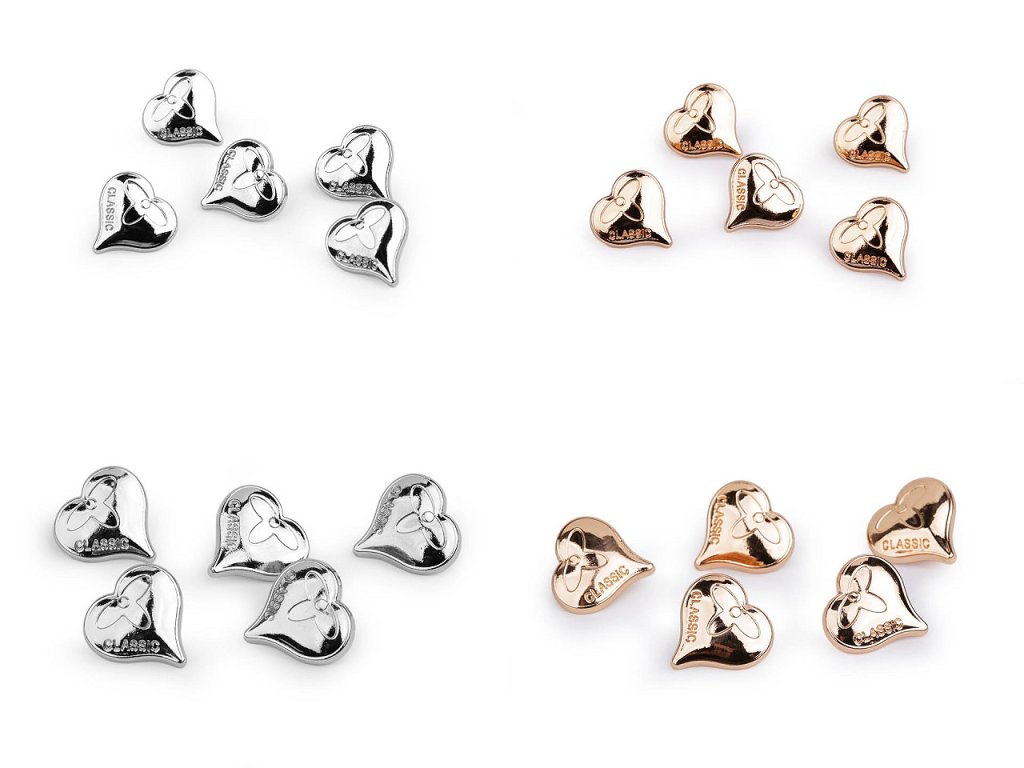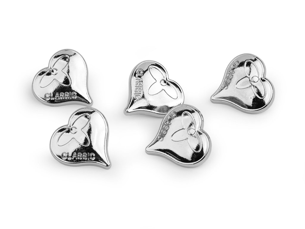 Kovové knoflíky ve tvaru srdce mají v sobě vyražený nápis "CLASSIC". Vyniknou na riflových bundách, košilích, šatech apod. Mají spodní přišívání a vysoký lesk.