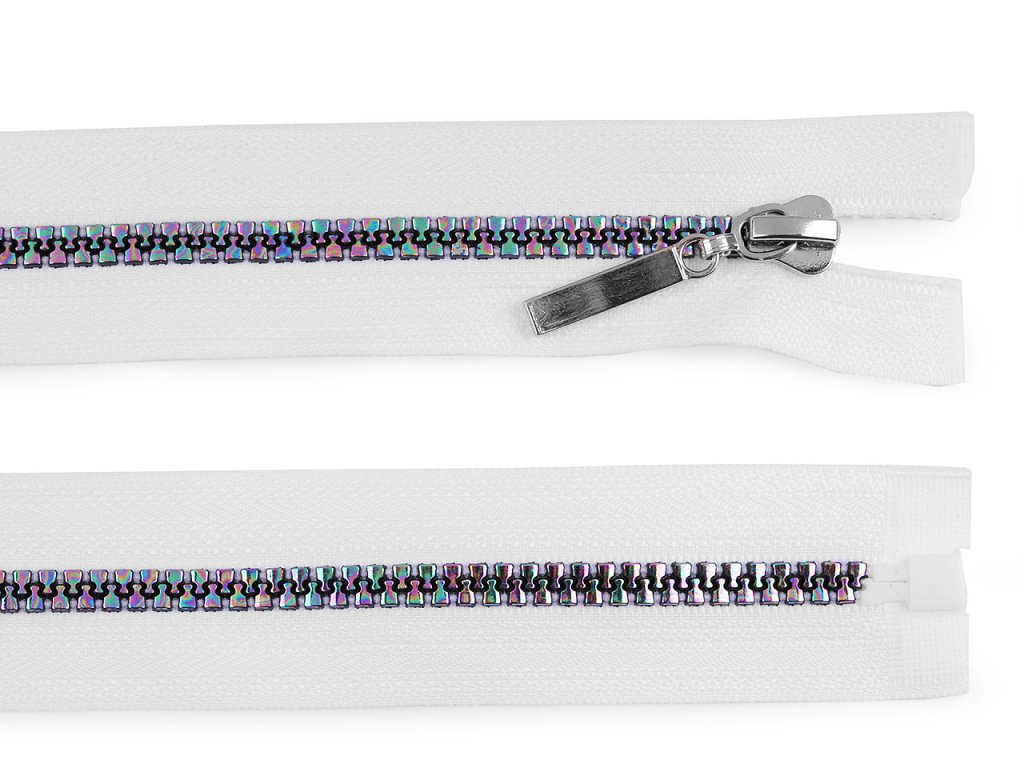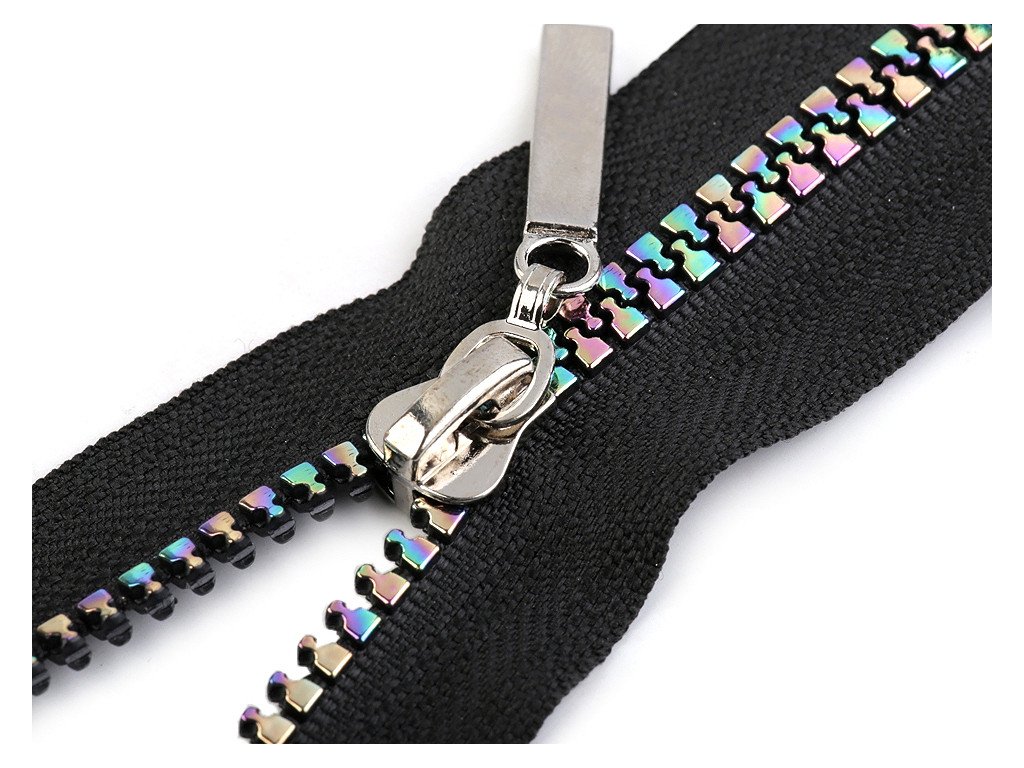 Dělitelný kostěný zip vás zaujme svým duhovým efektem, který povýší vaše oblečení na nevšední. Zip využijete na bundy, mikiny, svetry, apod.