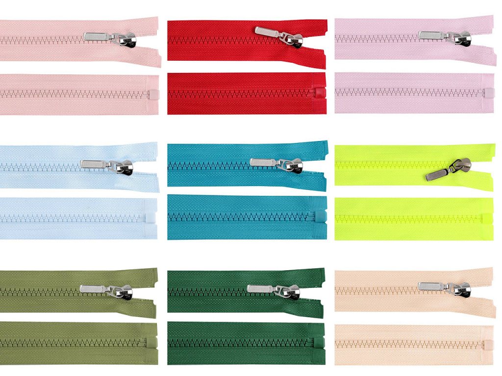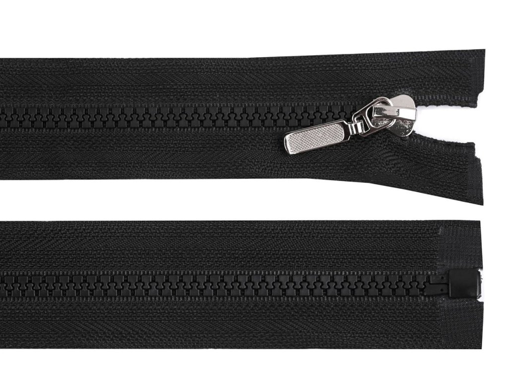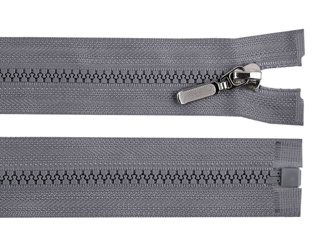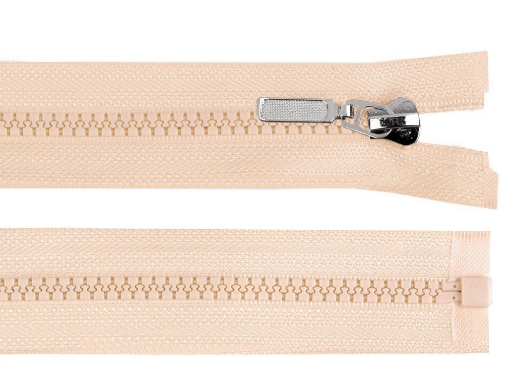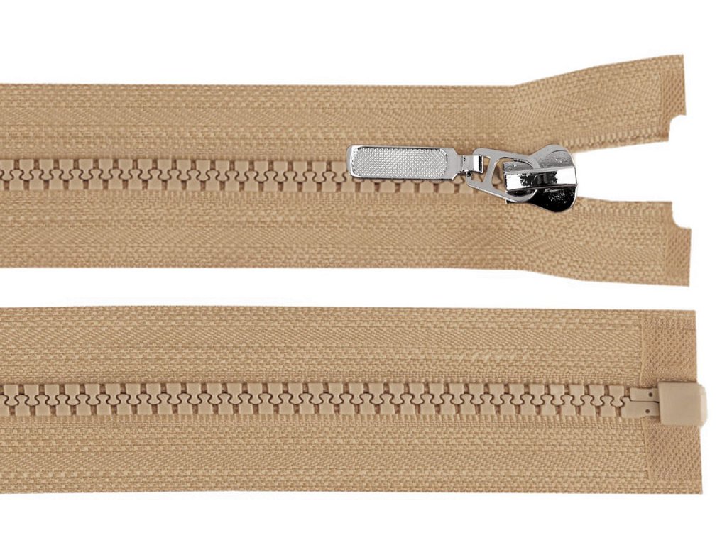 Kostěný zip s ozdobným kovovým jezdcem je vhodný k našití na bundy nebo kabáty.
