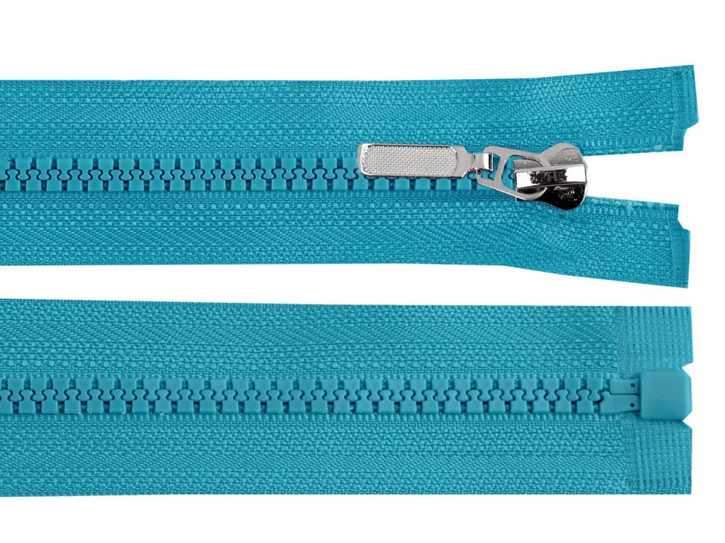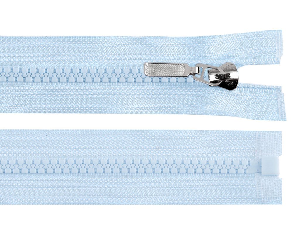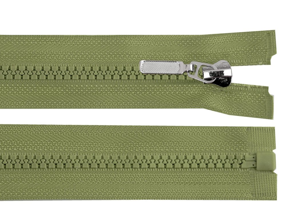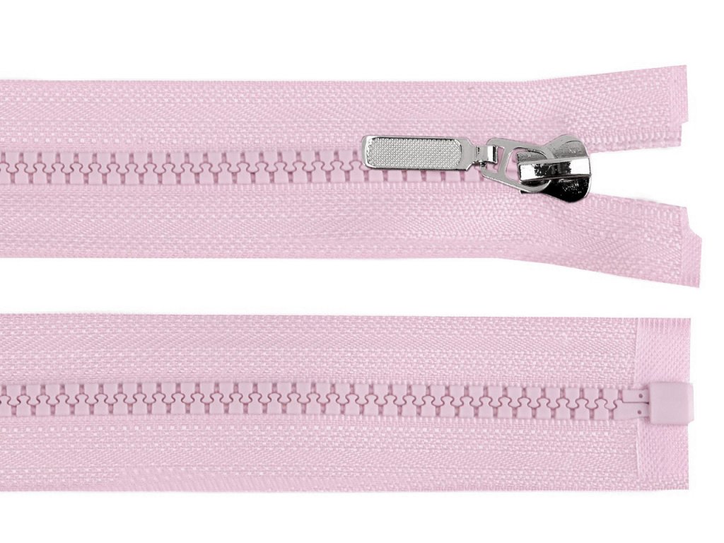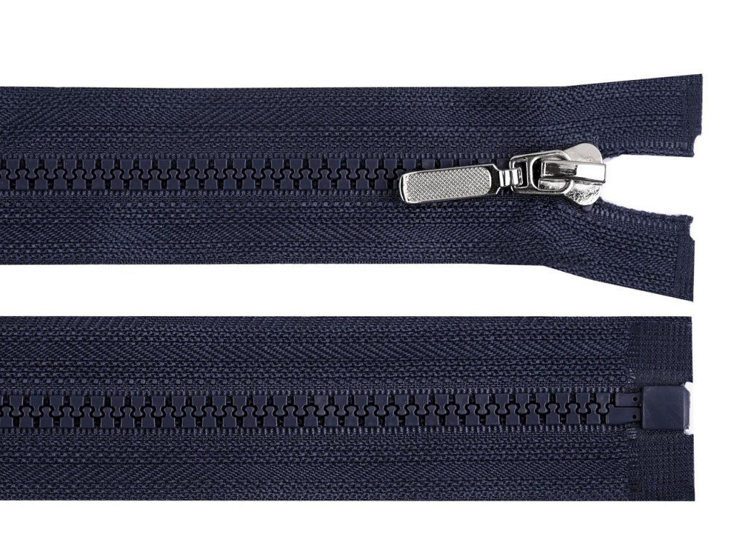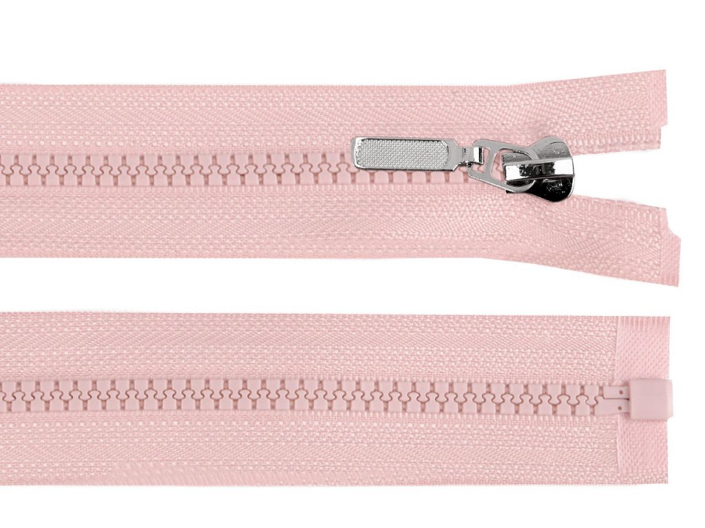 Kostěný zip s ozdobným kovovým jezdcem je vhodný k našití na bundy nebo kabáty.