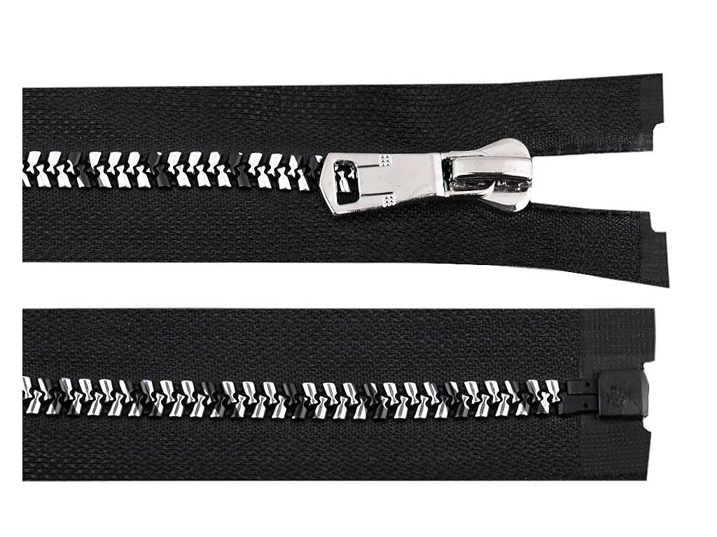 Kostěný zip se stříbrno-černými zoubky je vhodný k našití na bundy, kabátky, mikiny. Vynikne i na motorkářském oblečení.