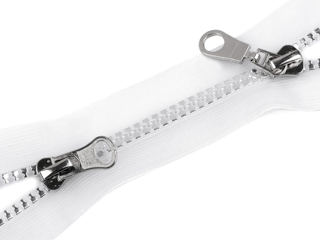 Transparentní kostěný zip se 2 jezdci můžete rozepnout z obou stran. Využijete ho na bundy, vesty nebo kabáty. [Zoubky jsou stříbrné.] [Jezdce nejsou stejné, liší se.]