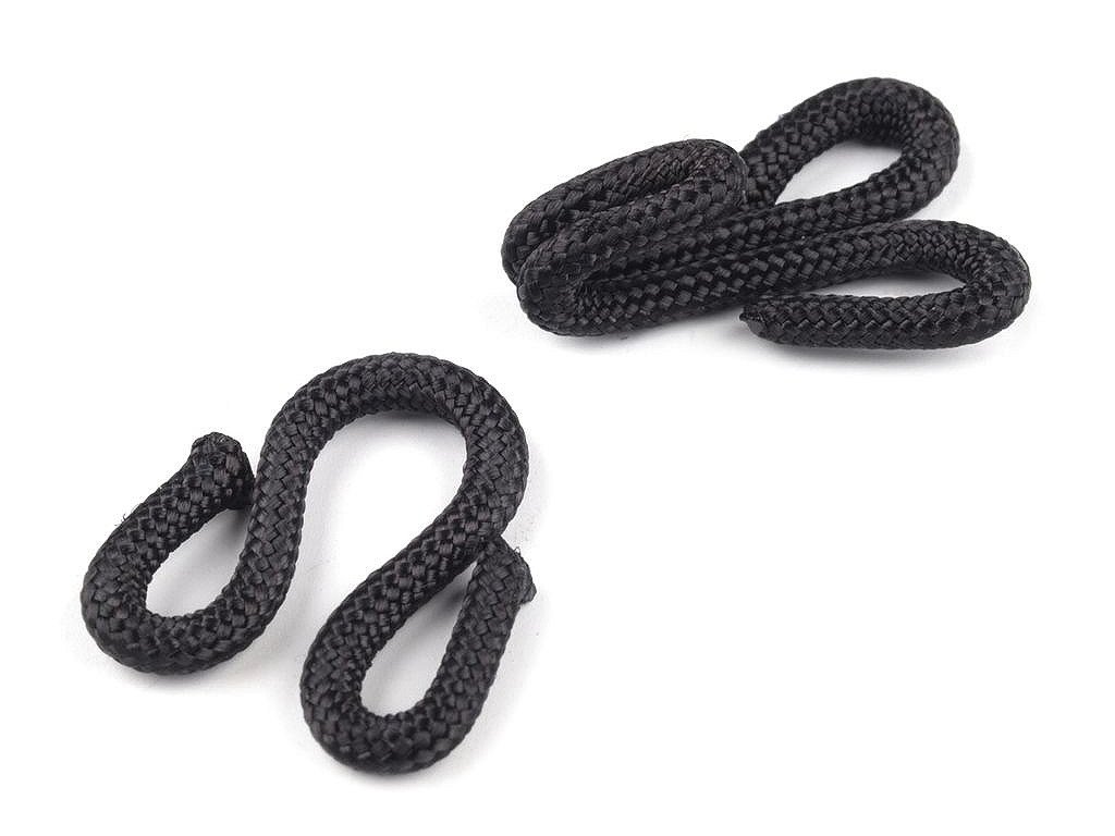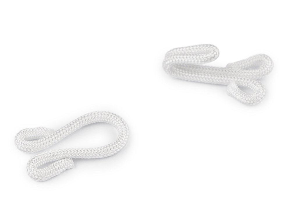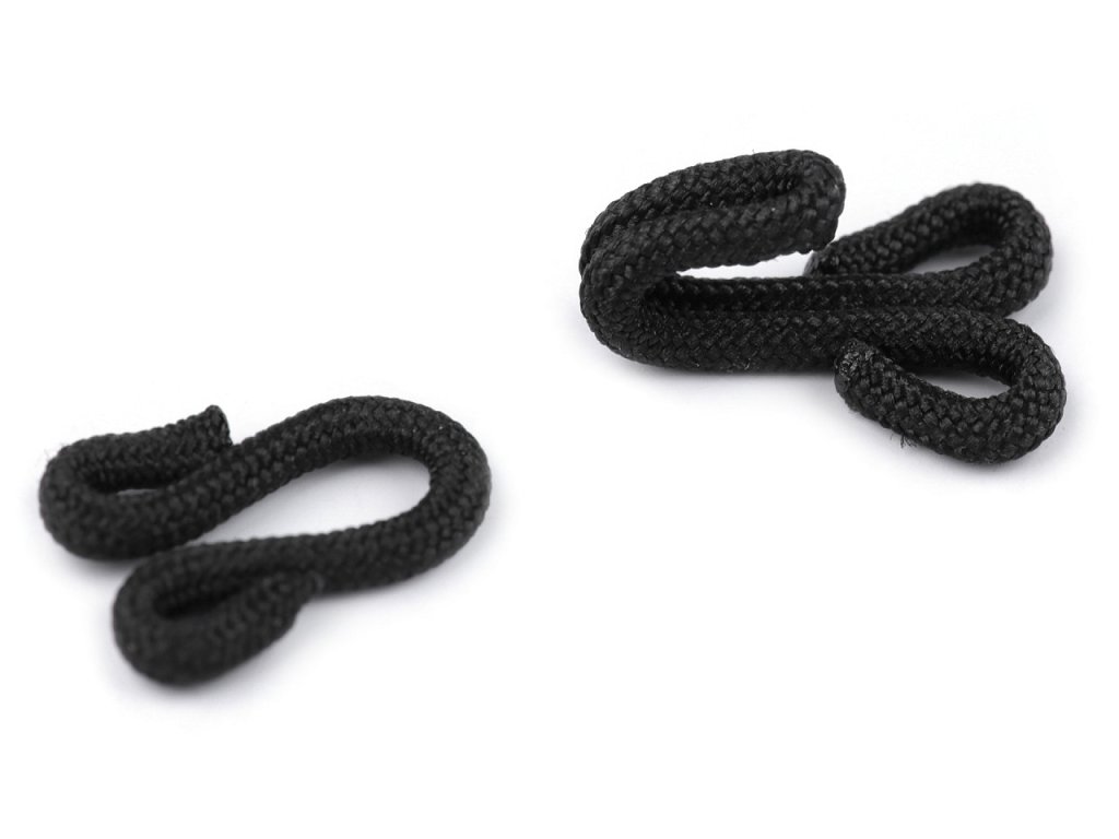 Kovový háček s očkem je potažený textilií. Používá se jako zapínání u oděvů, nejčastěji u vest nebo svetrů. Můžete ho využít také na tašky, kabelky apod.